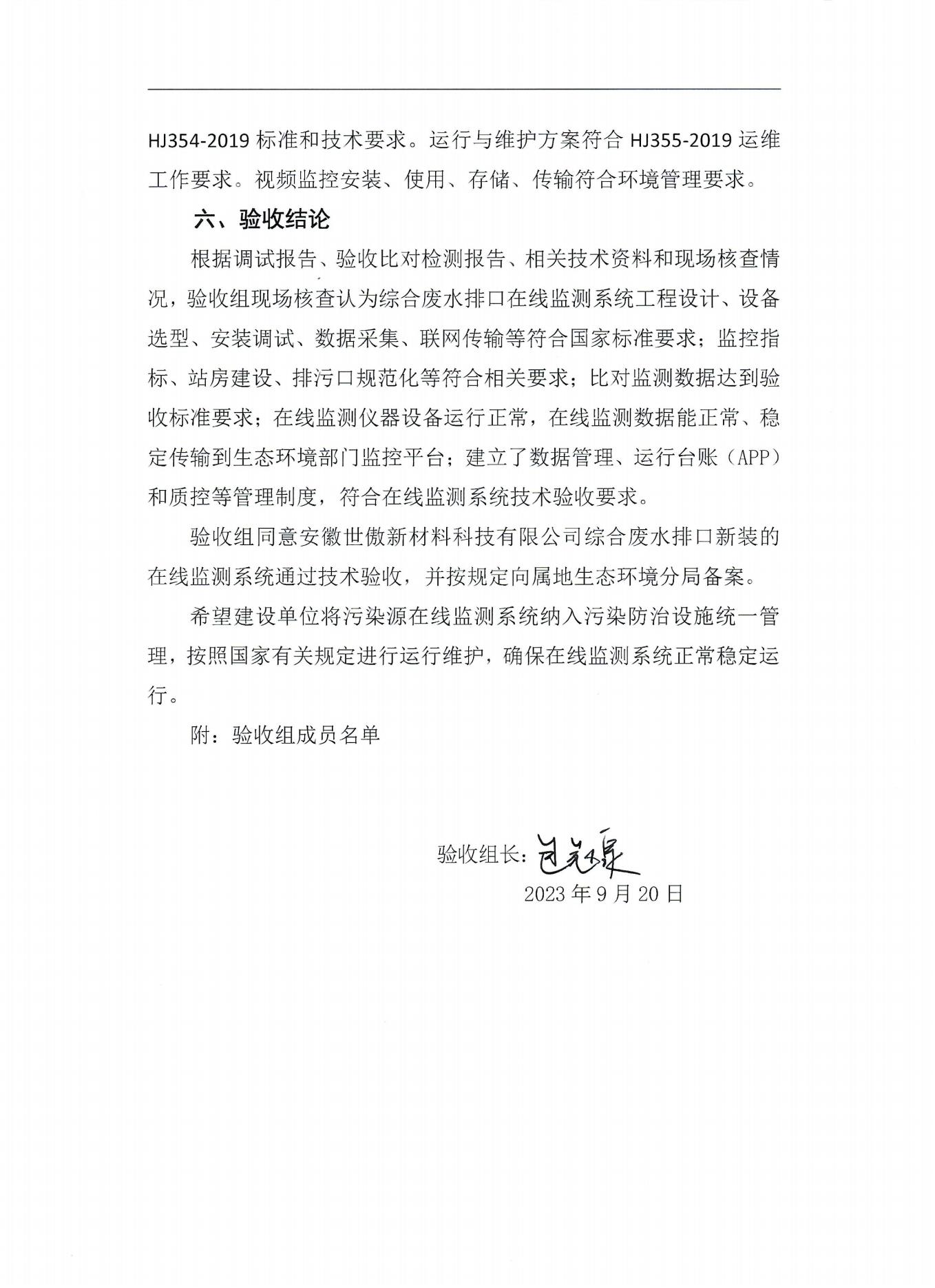 安徽世傲新材料科技有限公司—综合废水排放口污染源在线监测系统技术验收意见