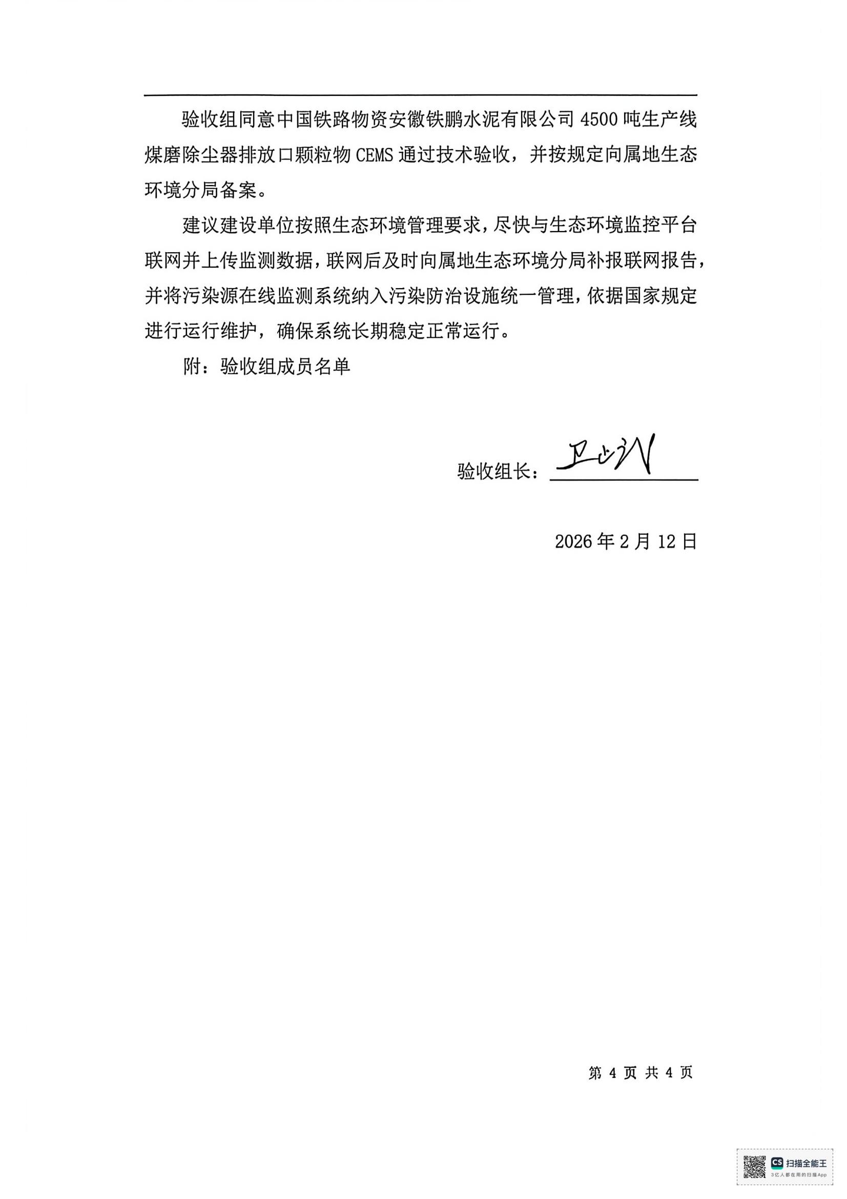 中国铁路物资安徽铁鹏水泥有限公司4号水泥磨收尘器烟气排放连续监测系统技术验收意见