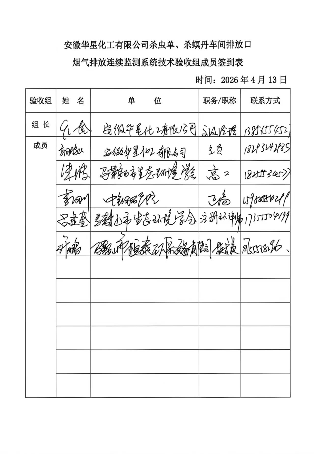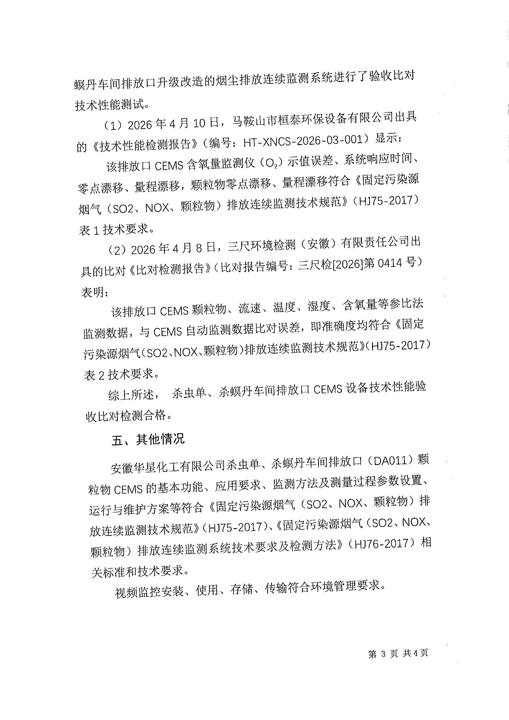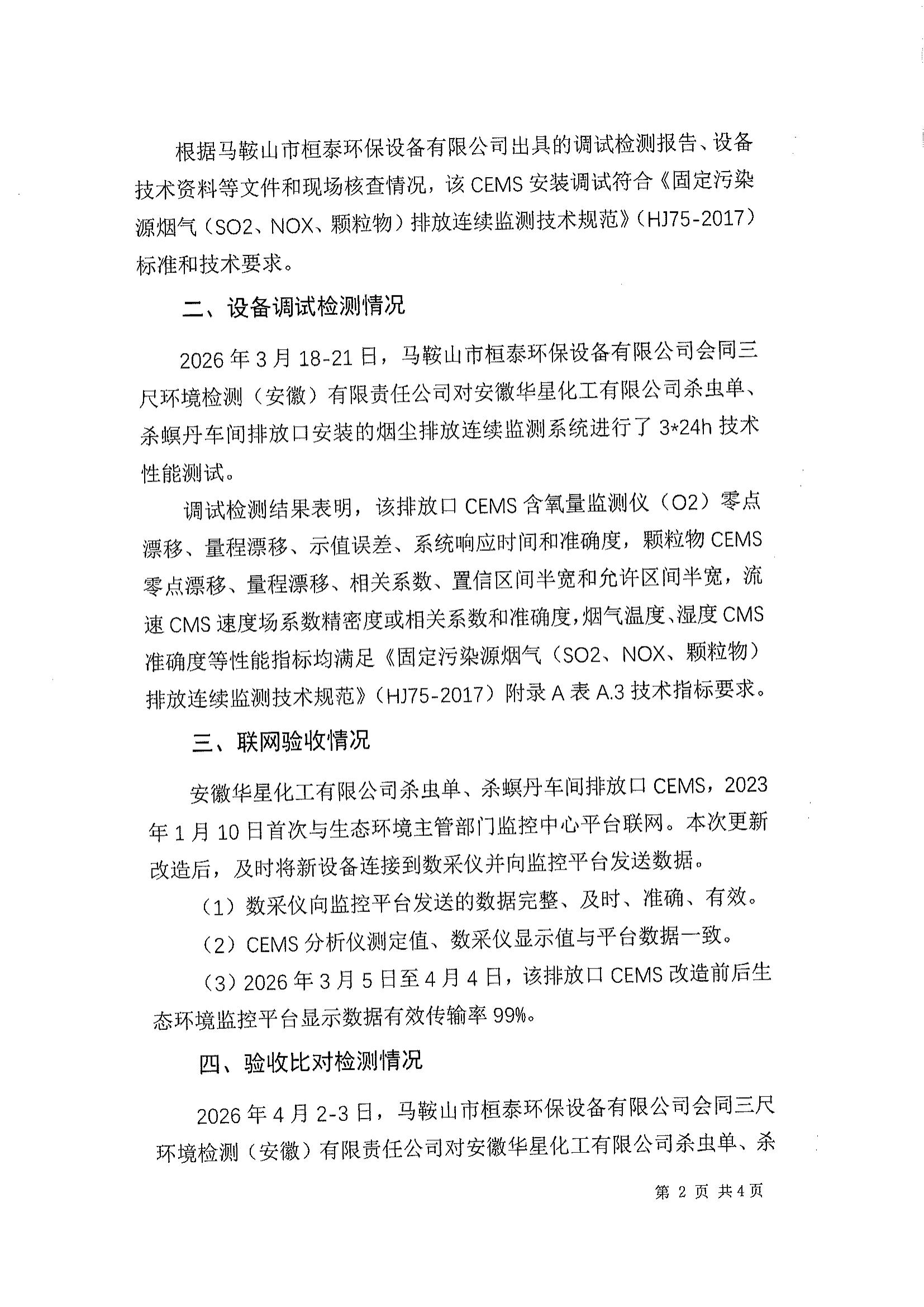 安徽华星化工有限公司杀虫单、杀螟丹车间排放口烟尘排放连续监测系统技术验收意见