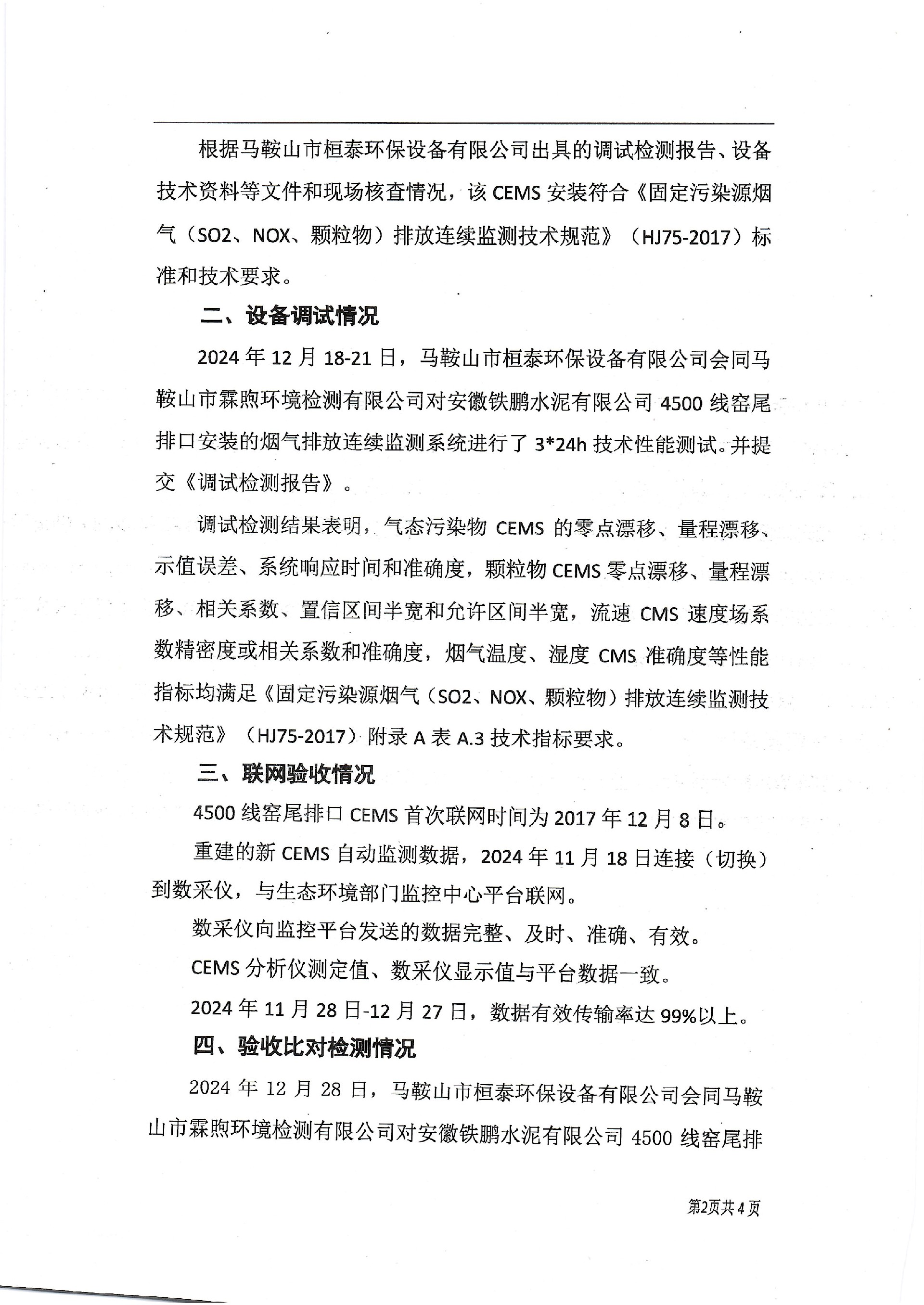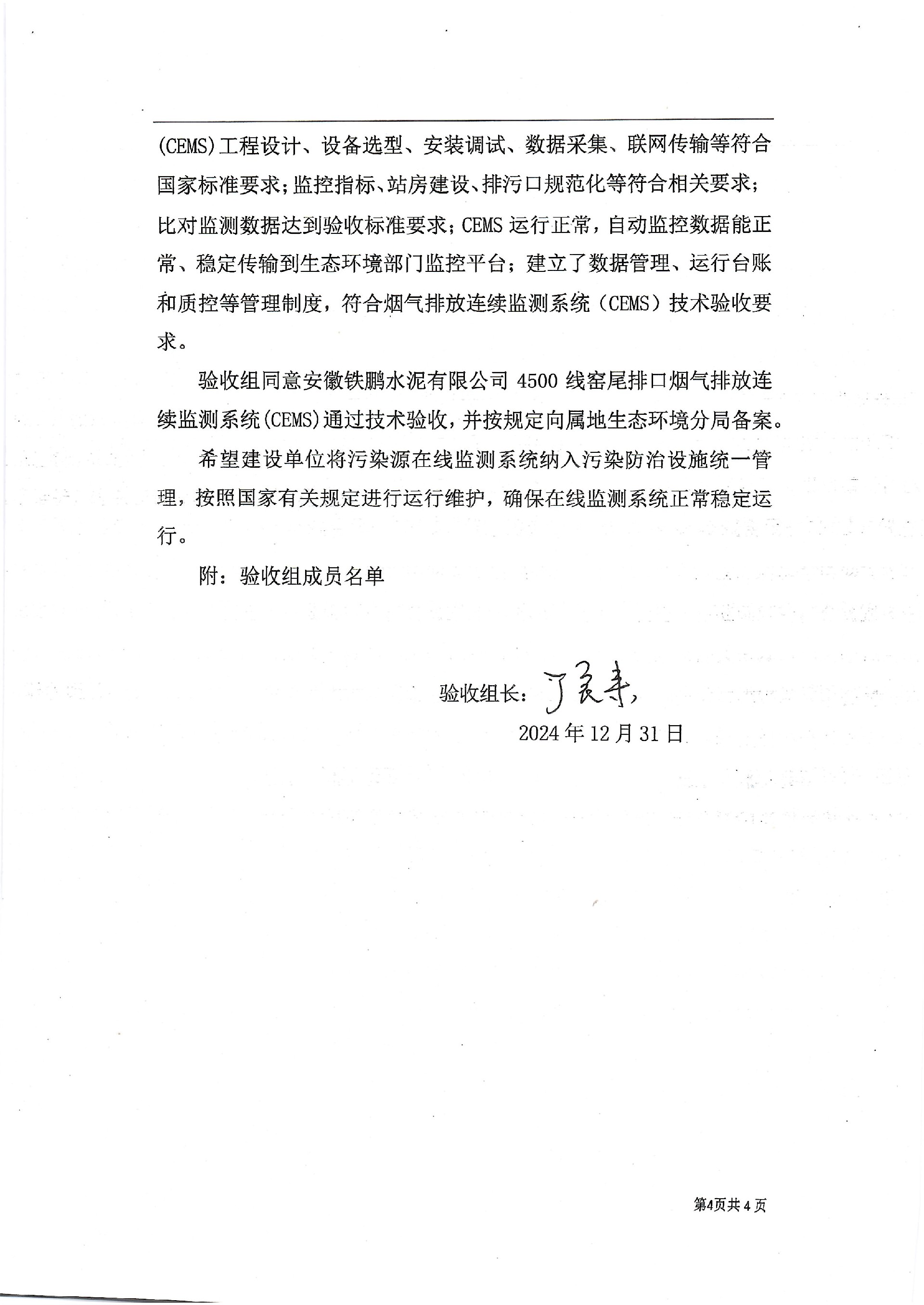 中国铁路物资安徽铁鹏水泥有限公司4500线窑尾排口烟气排放连续监测系统技术验收意见