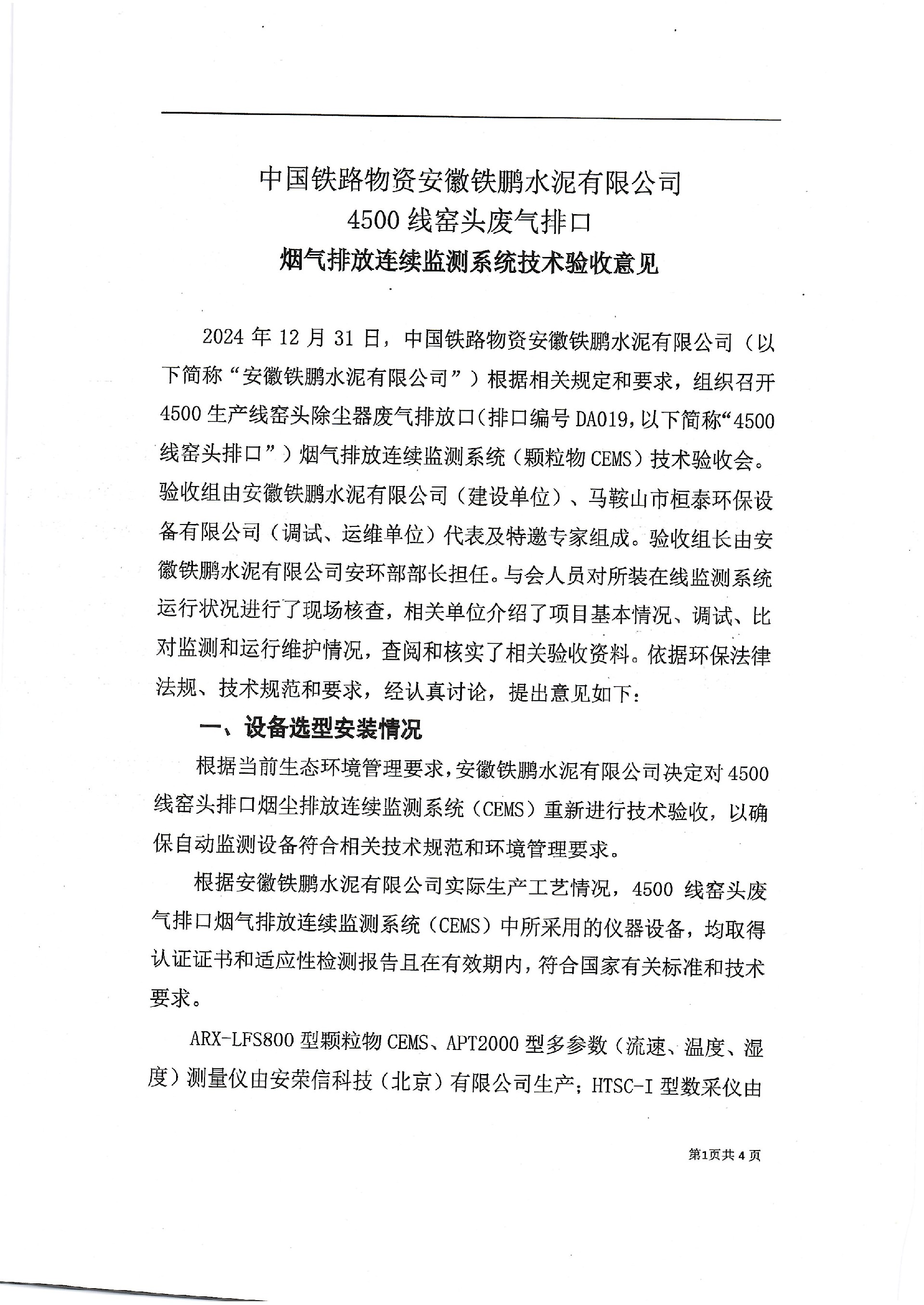 中国铁路物资安徽铁鹏水泥有限公司4500线窑尾排口烟气排放连续监测系统技术验收意见