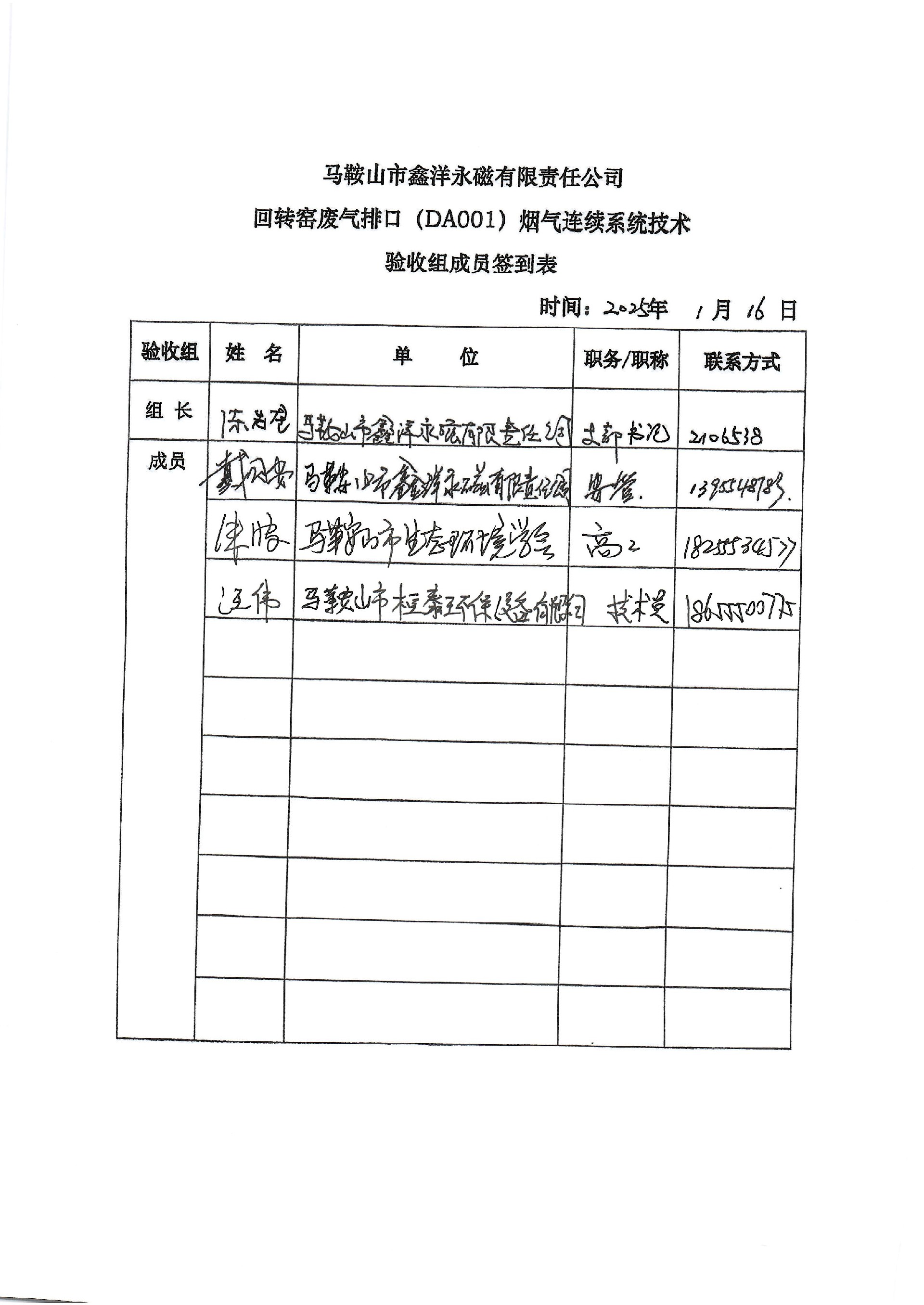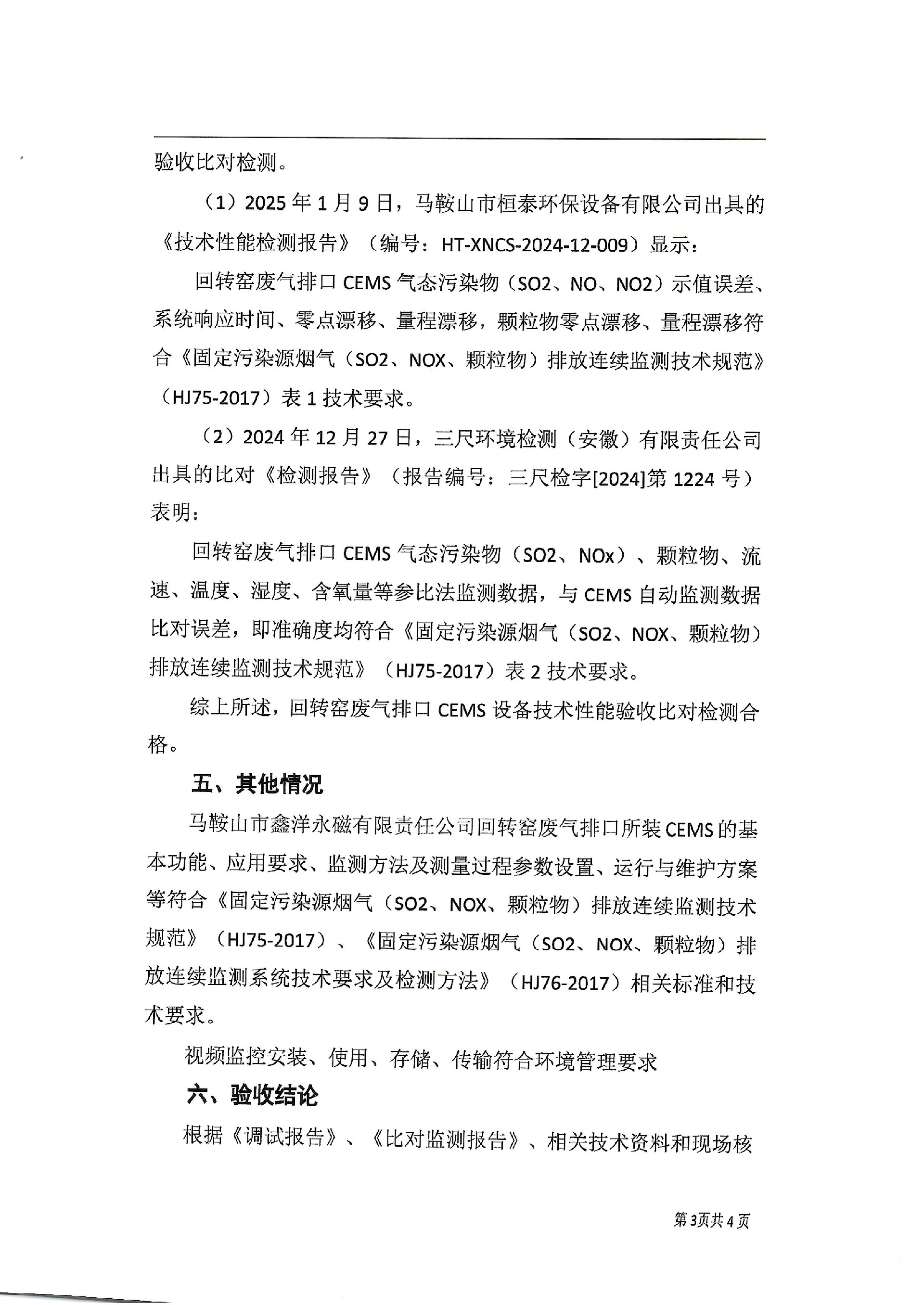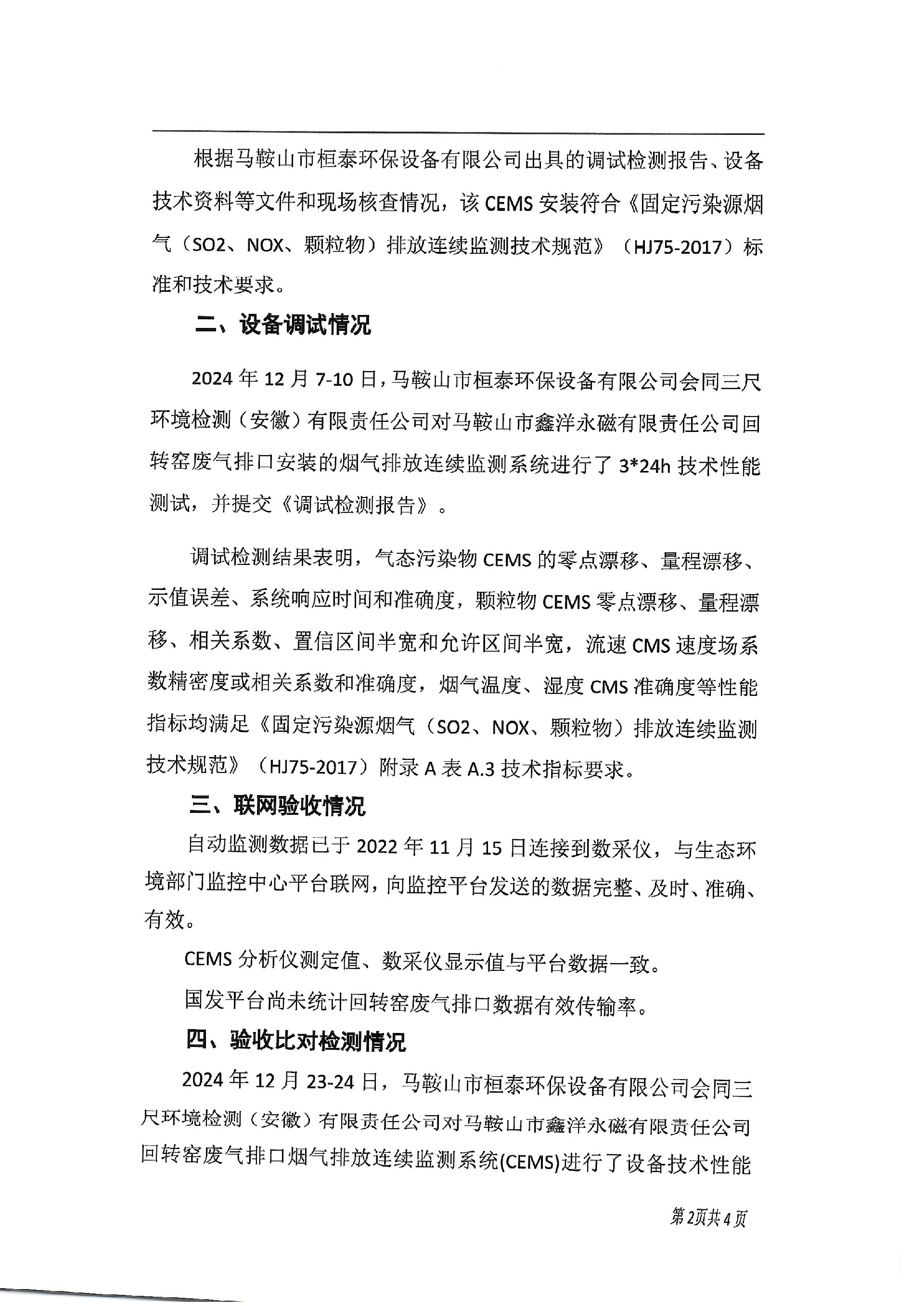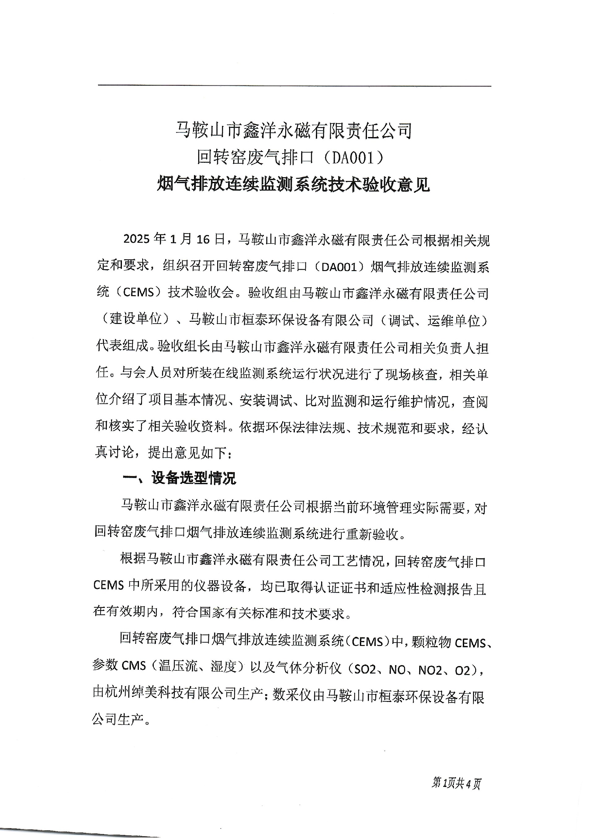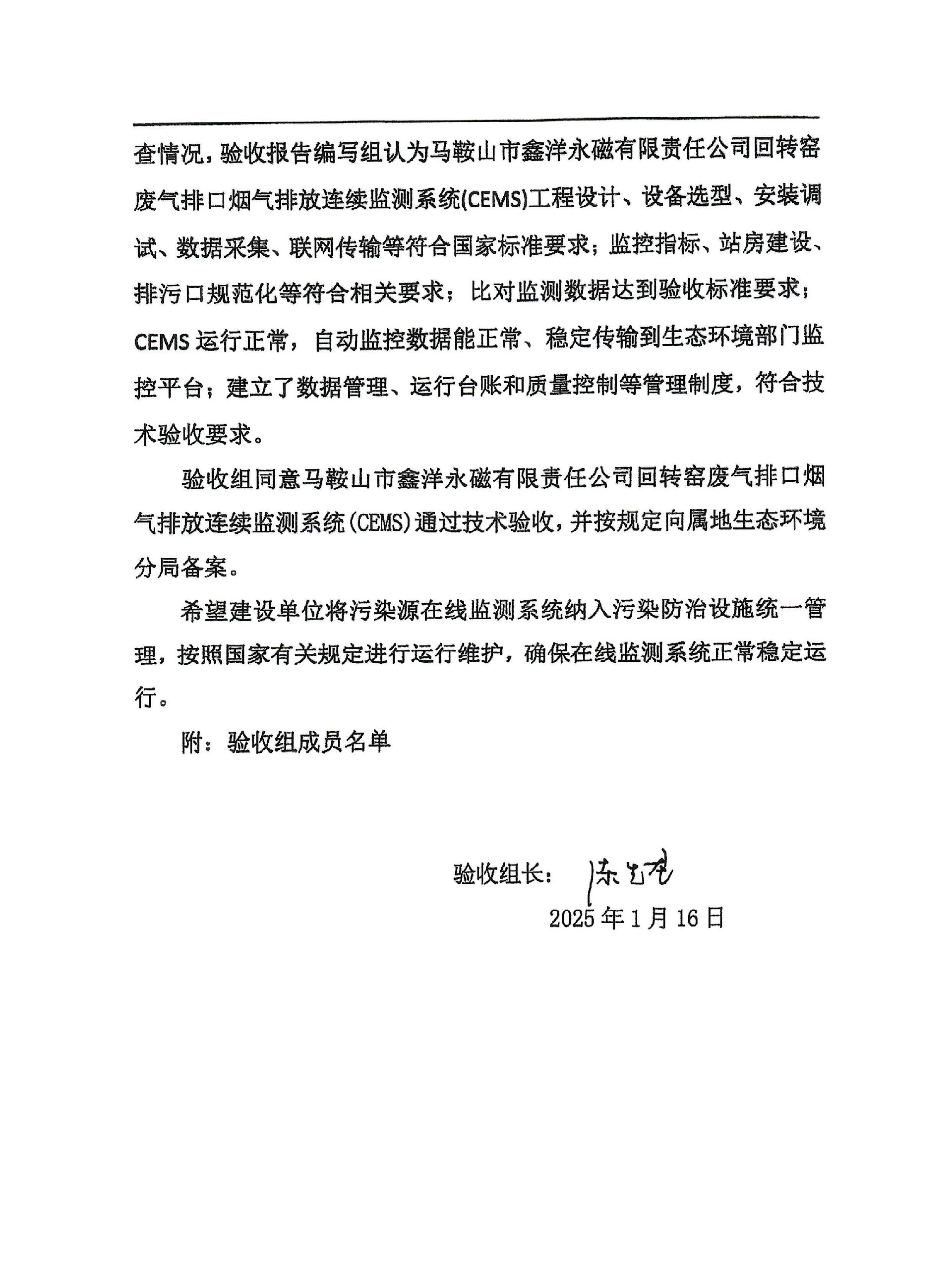 马鞍山市鑫洋永磁有限责任公司回转窑废气排口(DA001)烟气排放连续监测系统技术验收意见