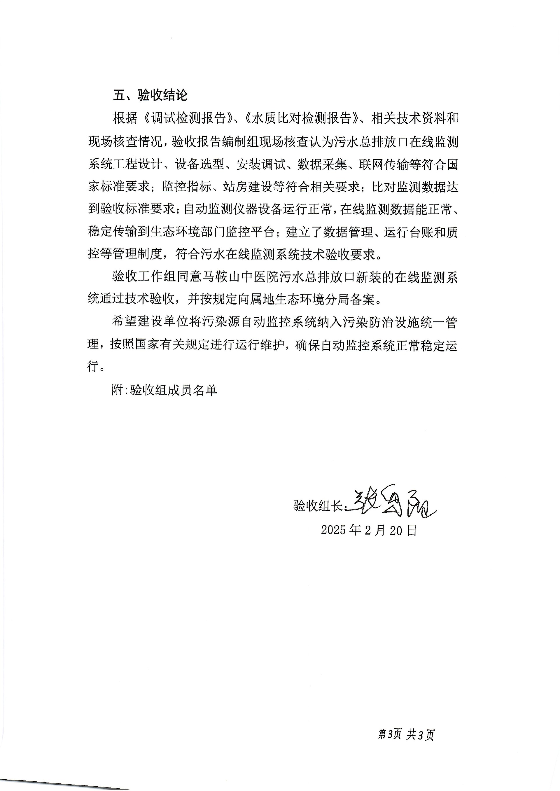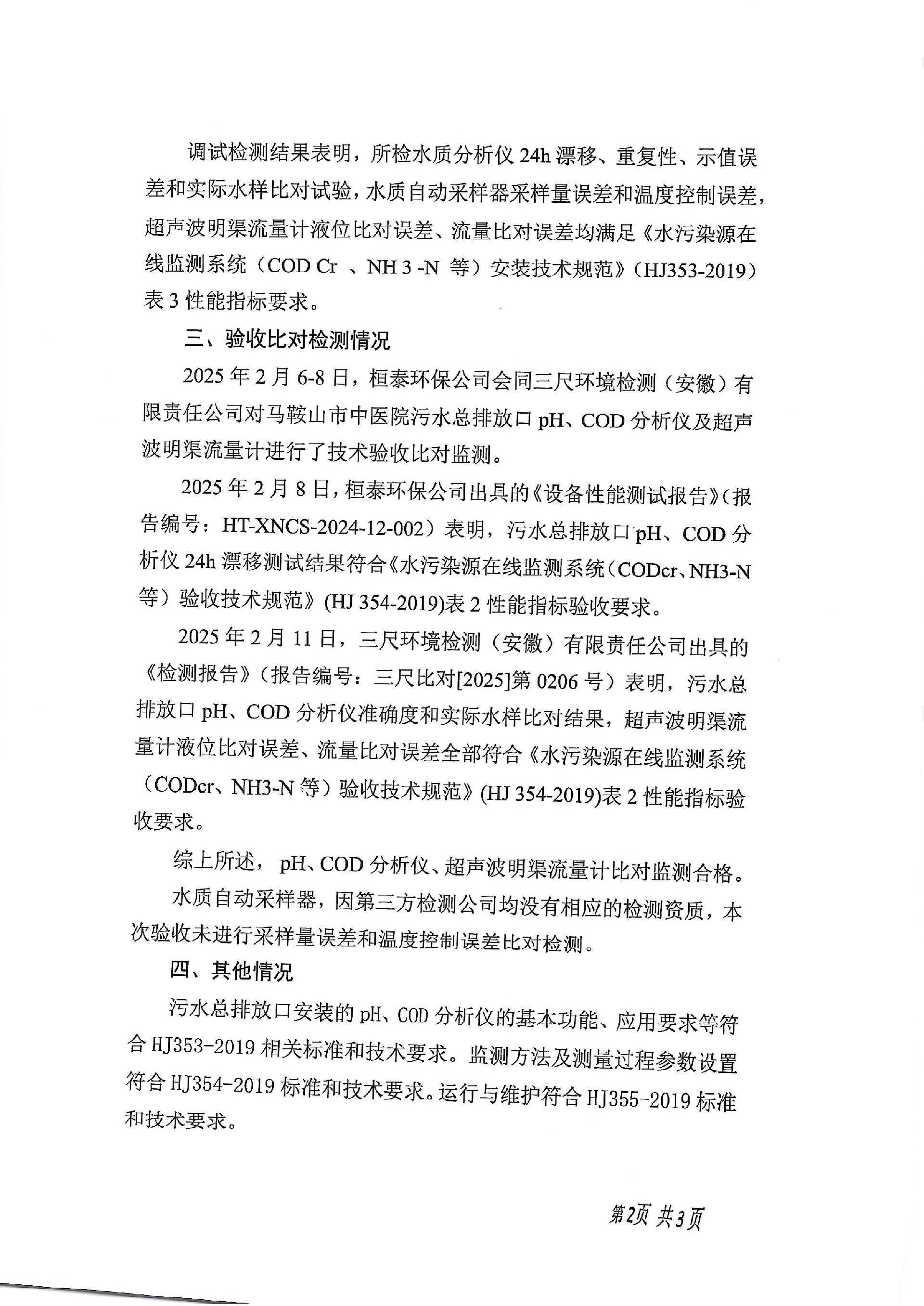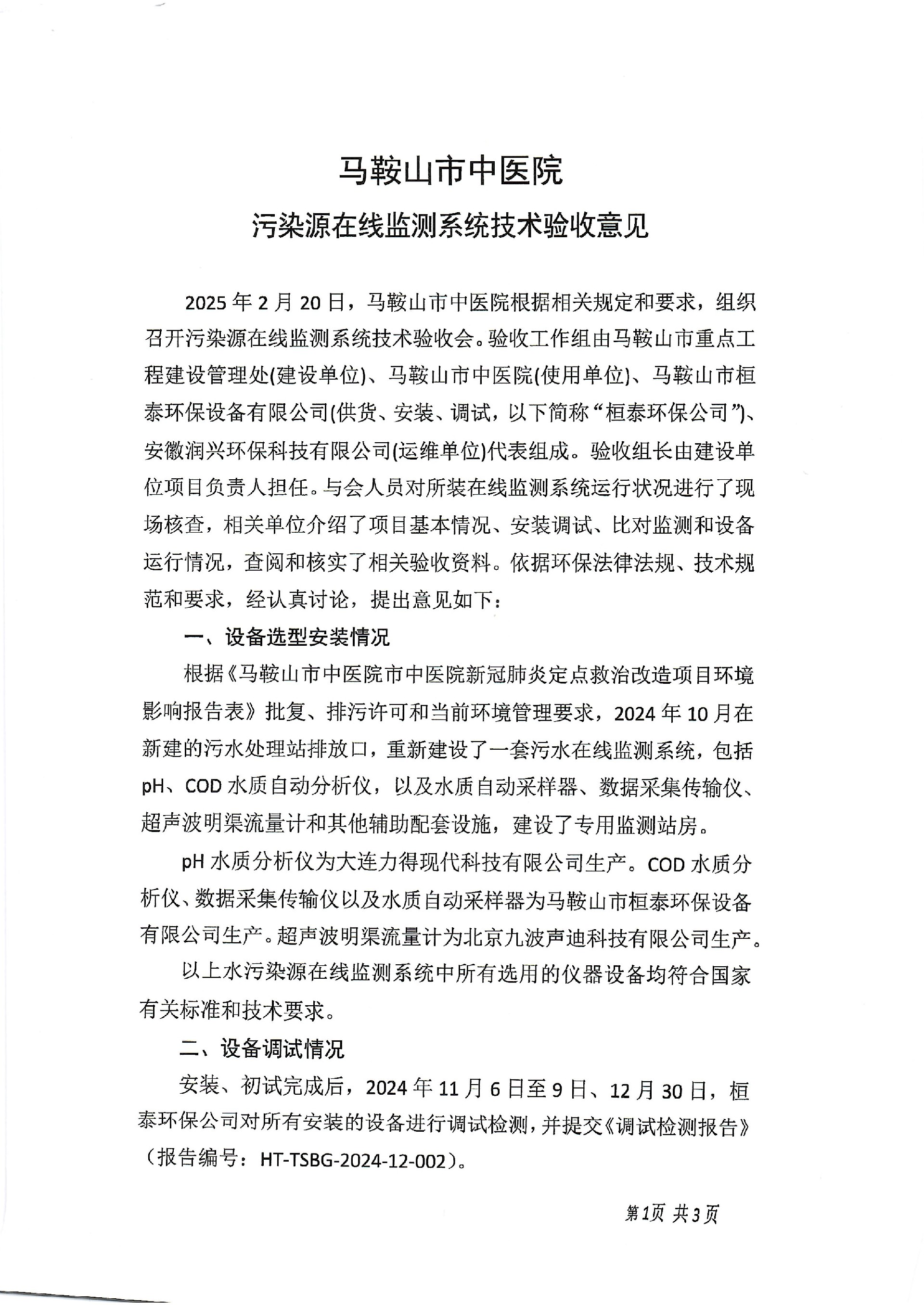 马鞍山市中医院污染源在线监测系统技术验收意见