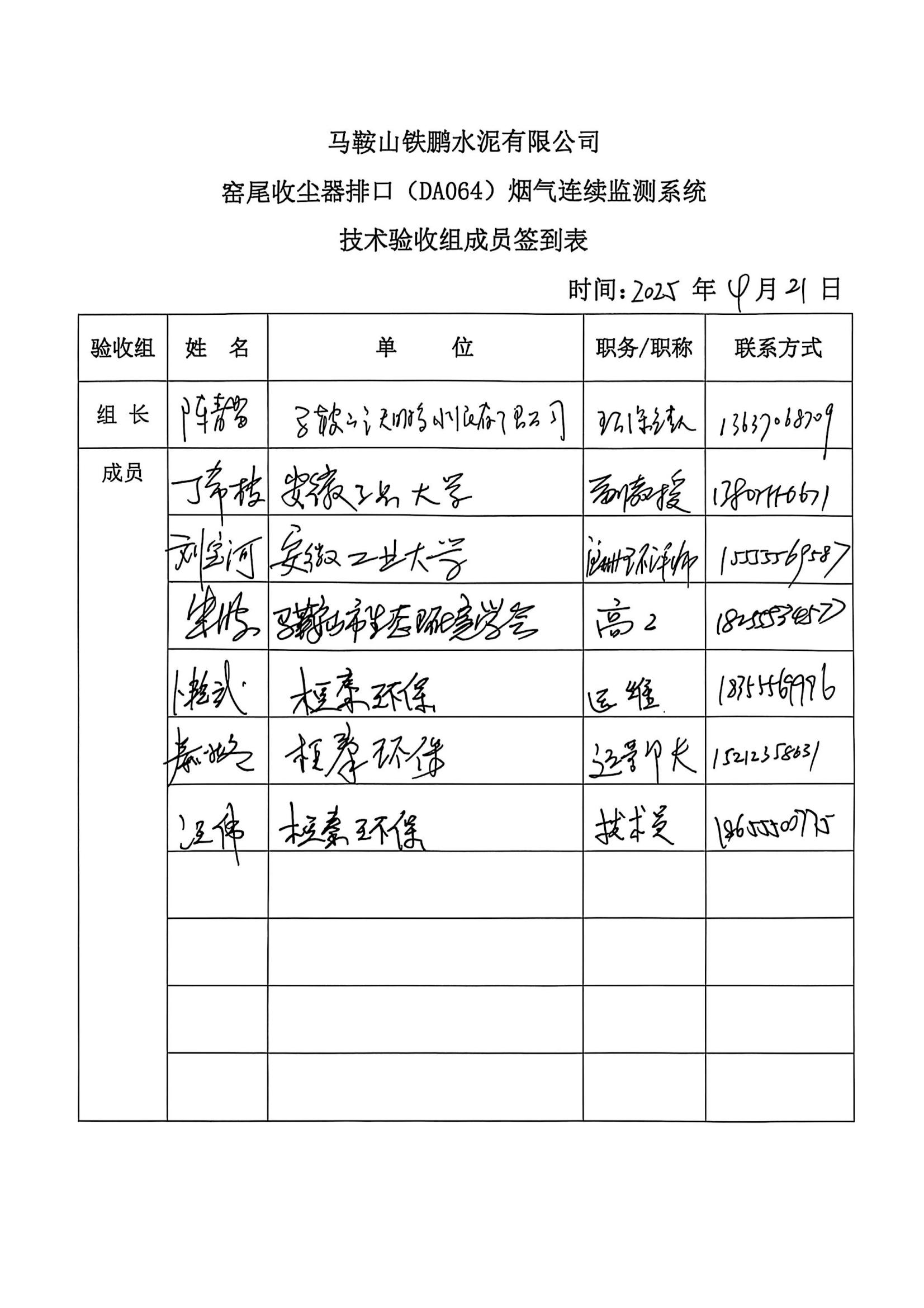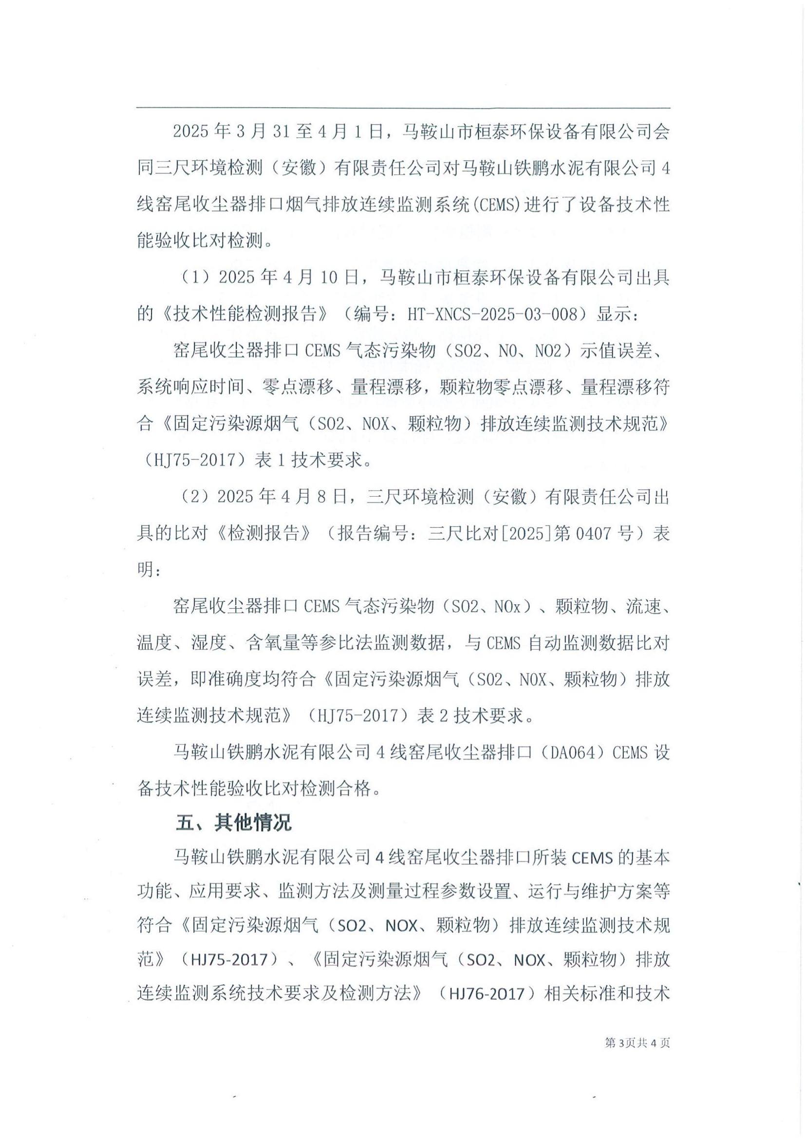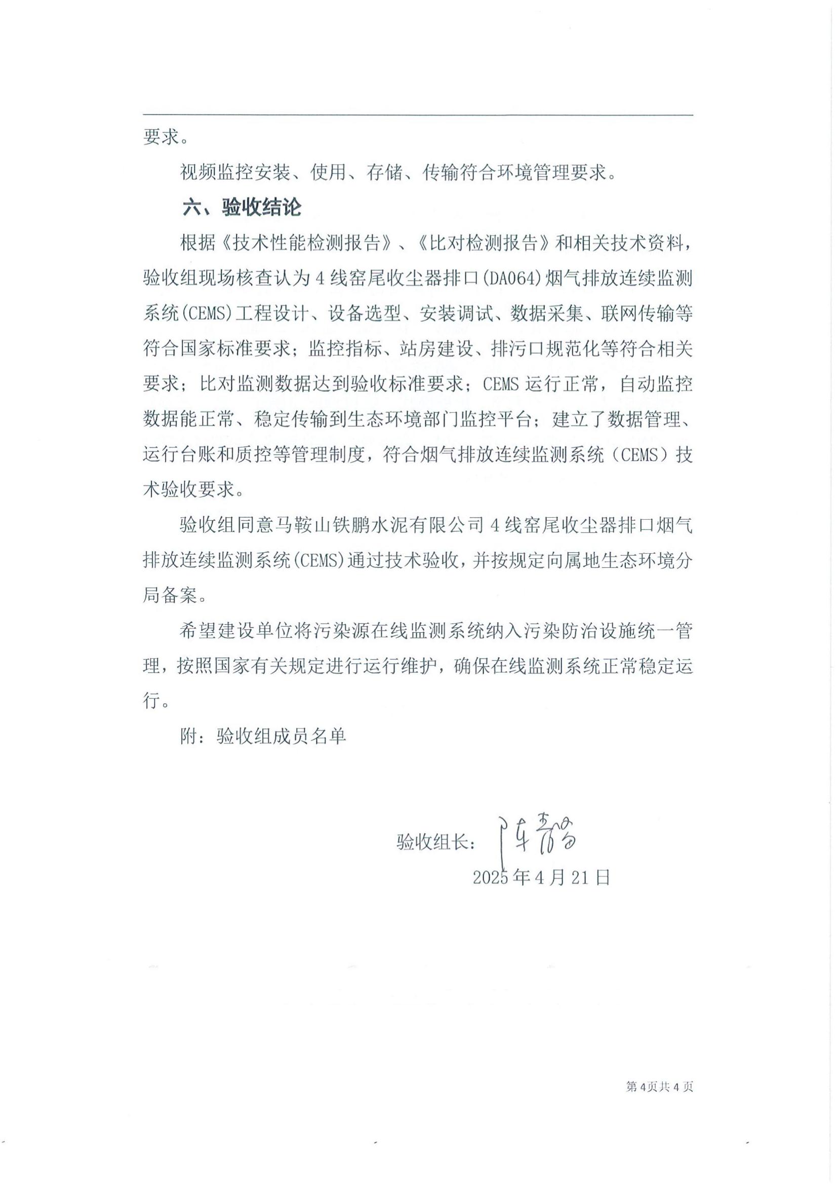马鞍山铁鹏水泥有限公司4线窑尾收尘器排口烟气排放连续监测系统技术验收意见