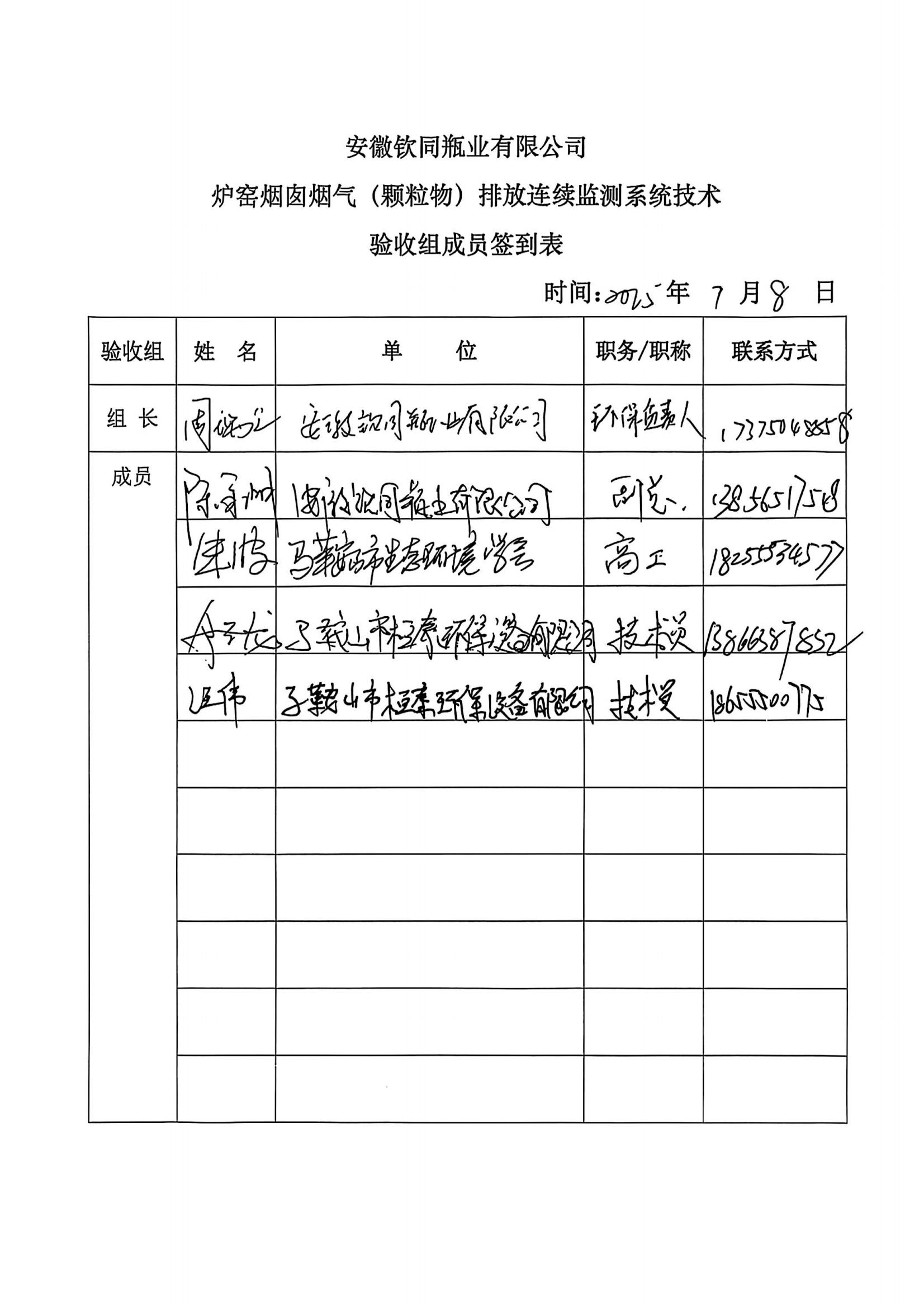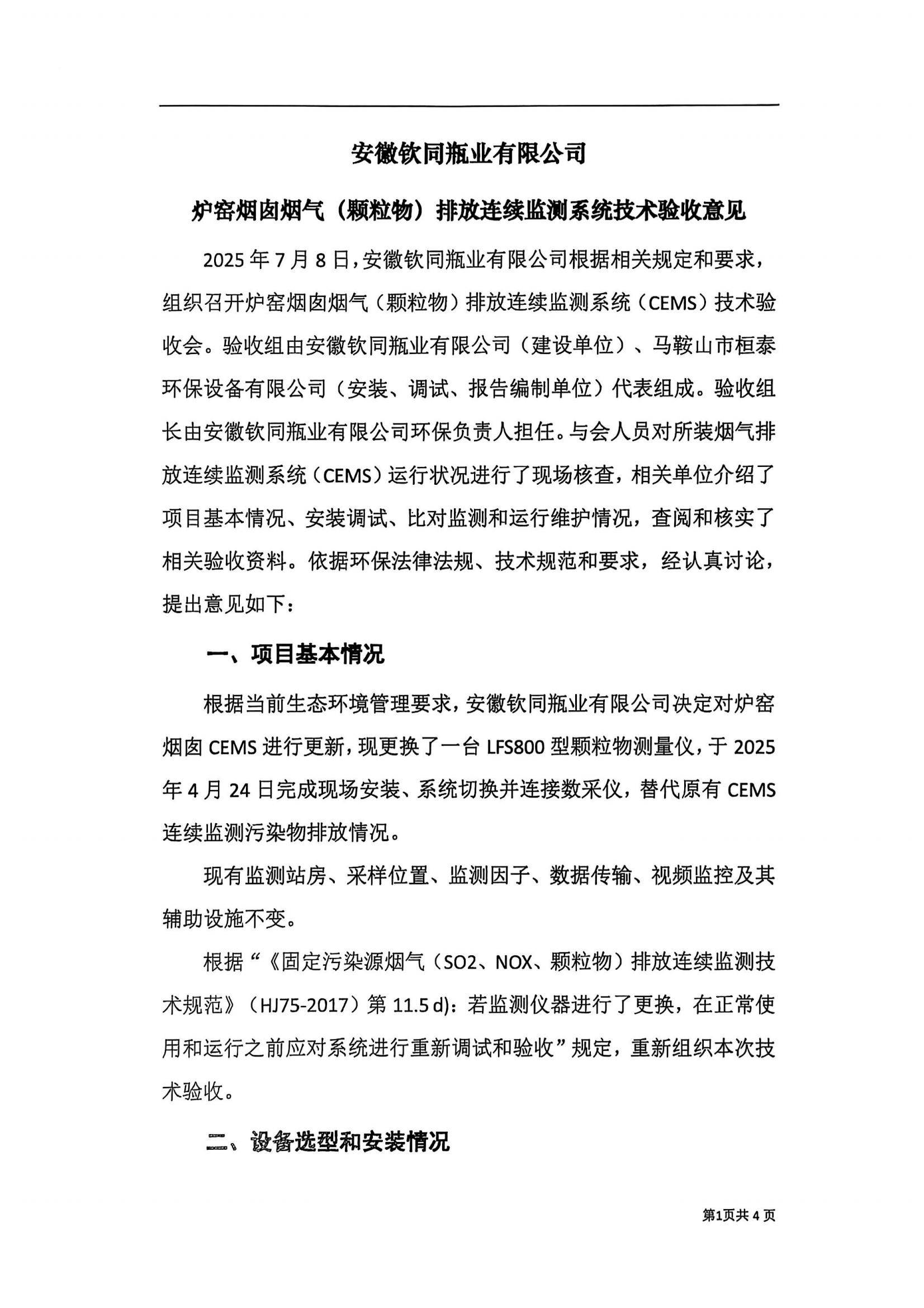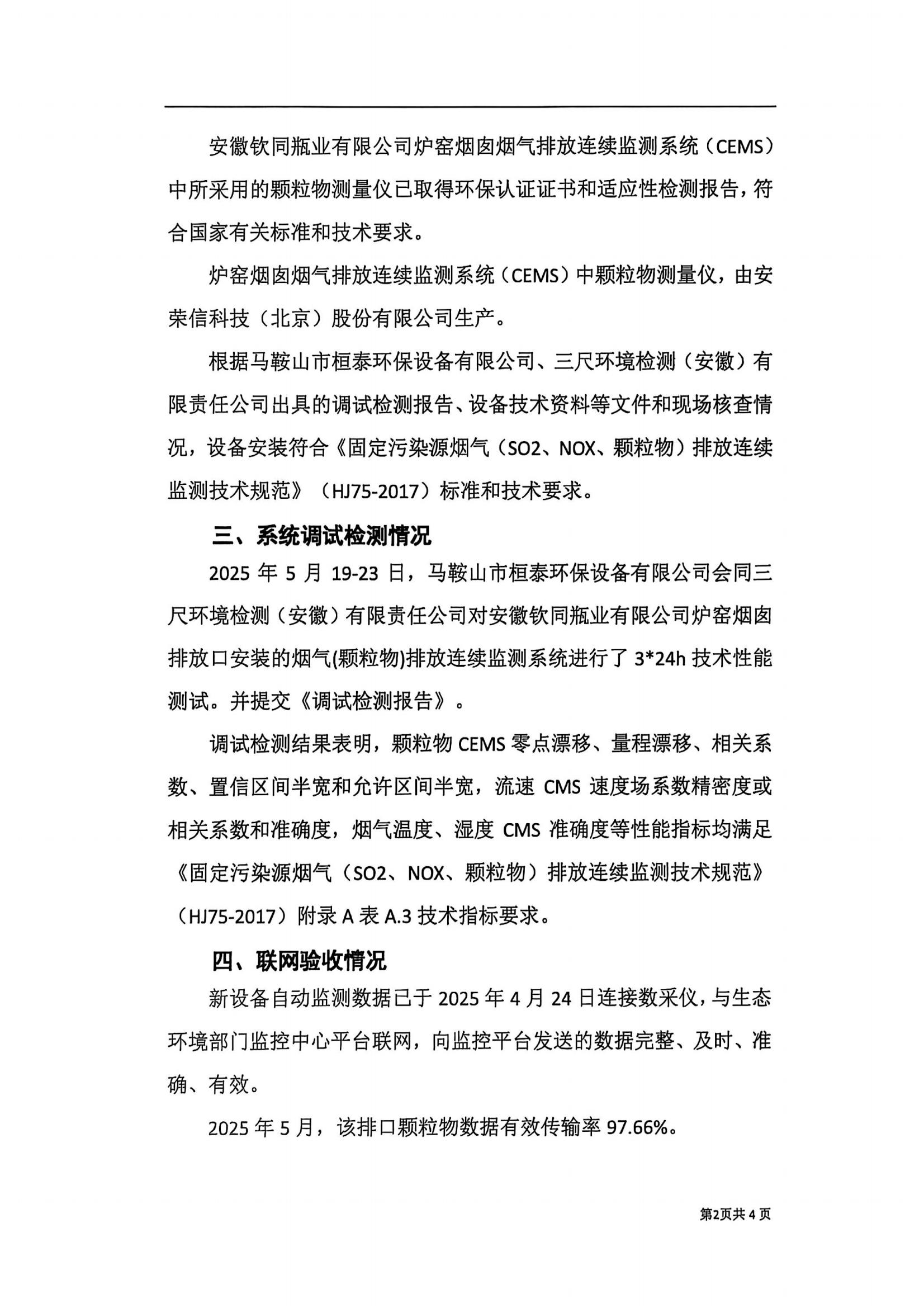 安徽钦同瓶业有限公司炉窑烟囱烟气(颗粒物)排放连续监测系统技术验收意见