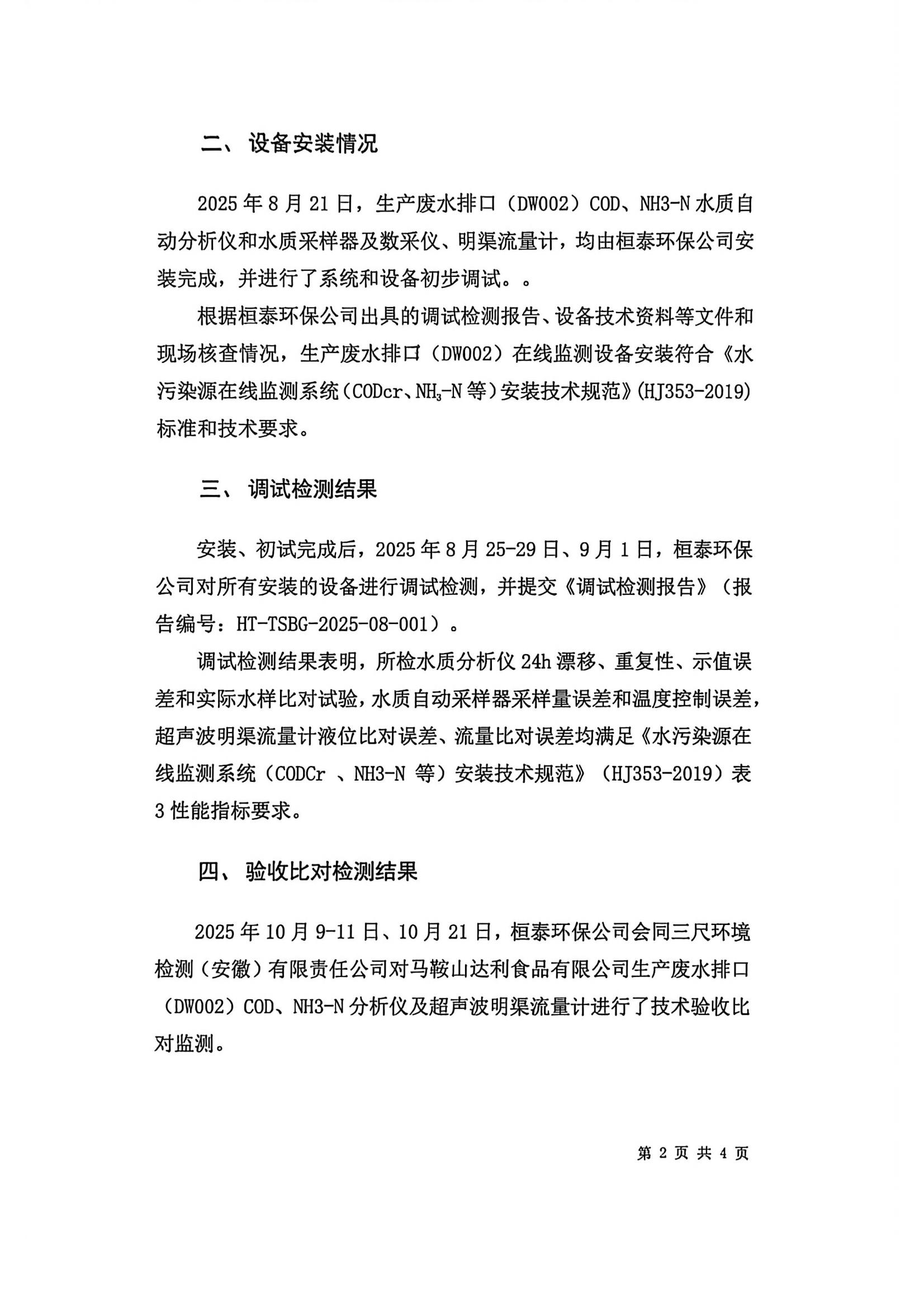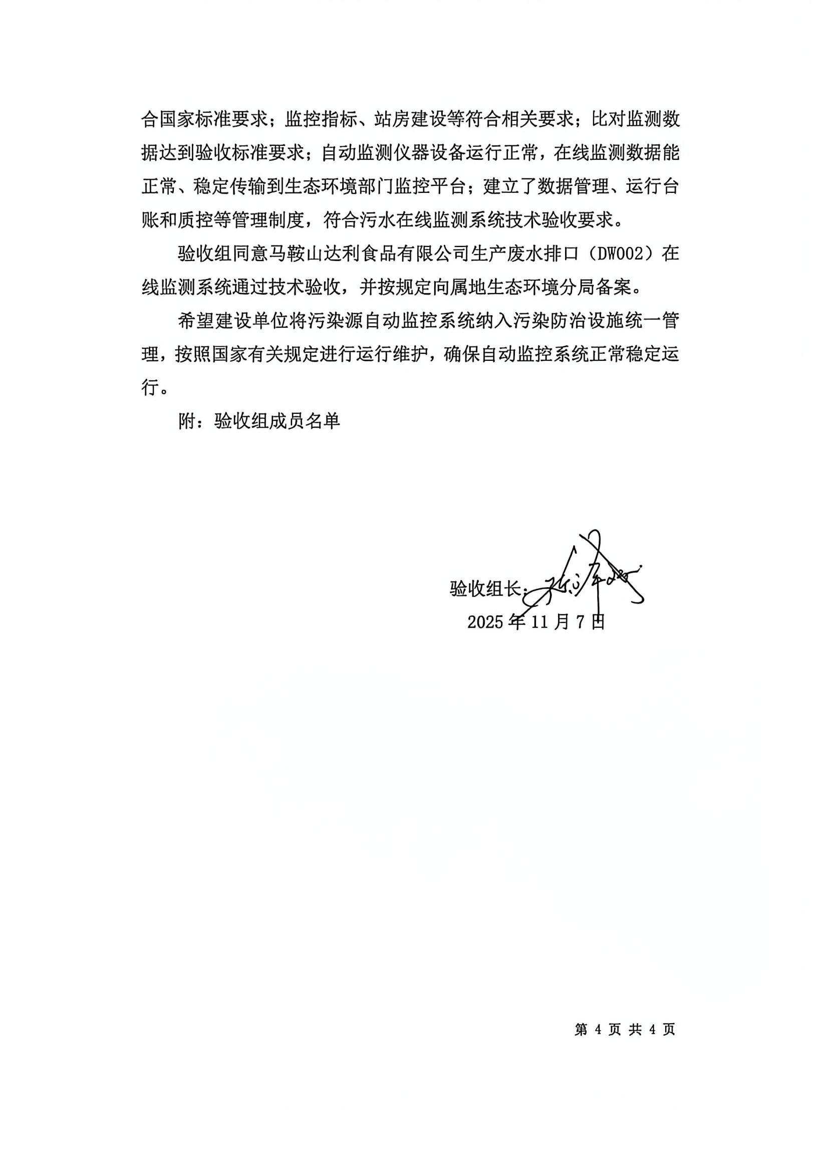 马鞍山达利食品有限公司水污染源在线监测系统技术验收意见