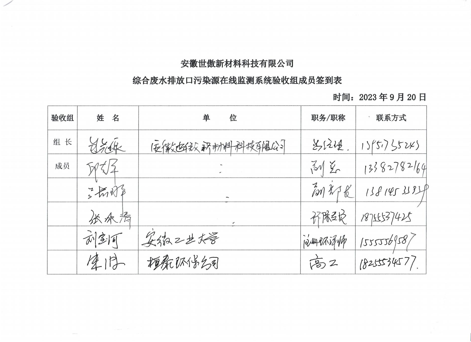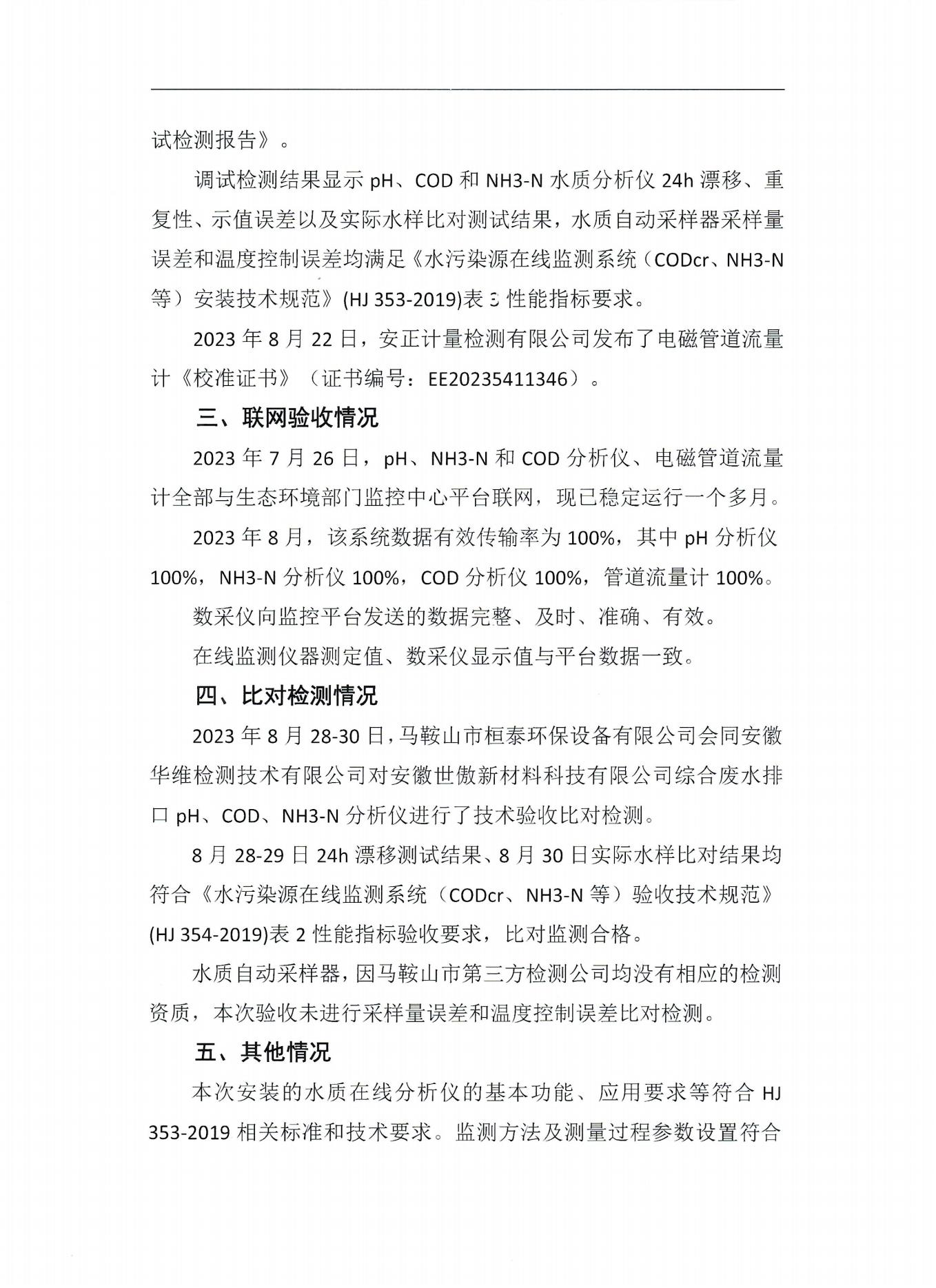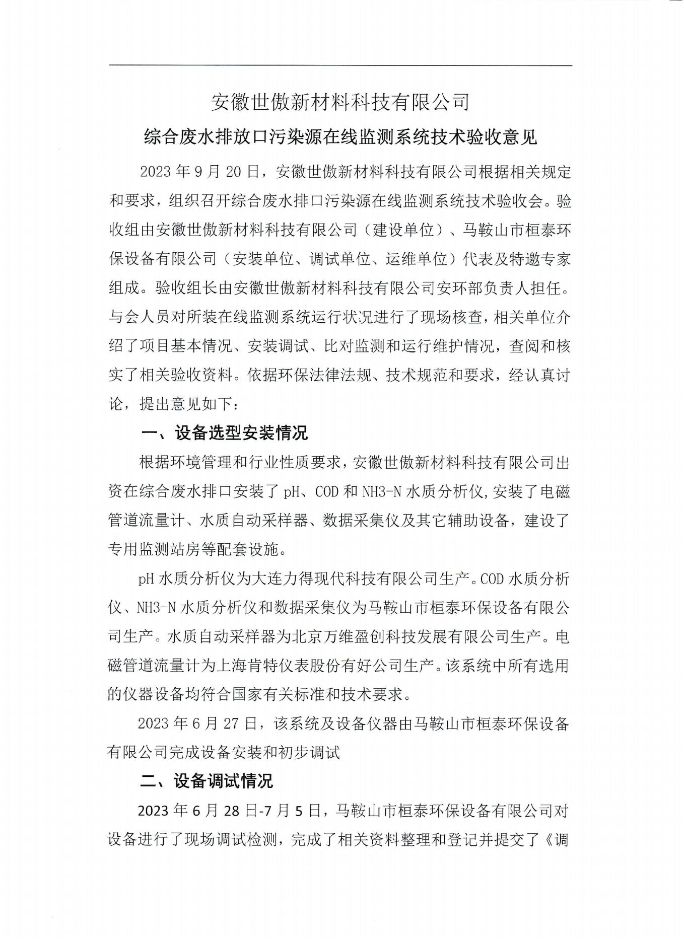 安徽世傲新材料科技有限公司—综合废水排放口污染源在线监测系统技术验收意见