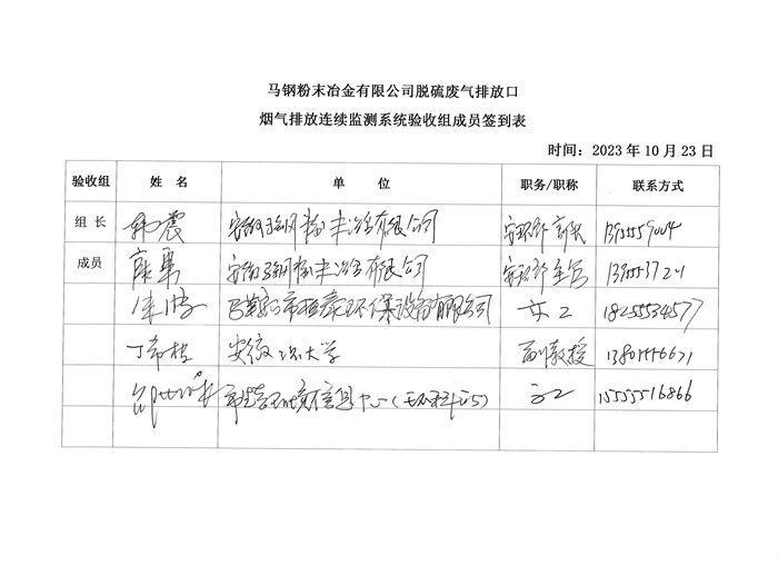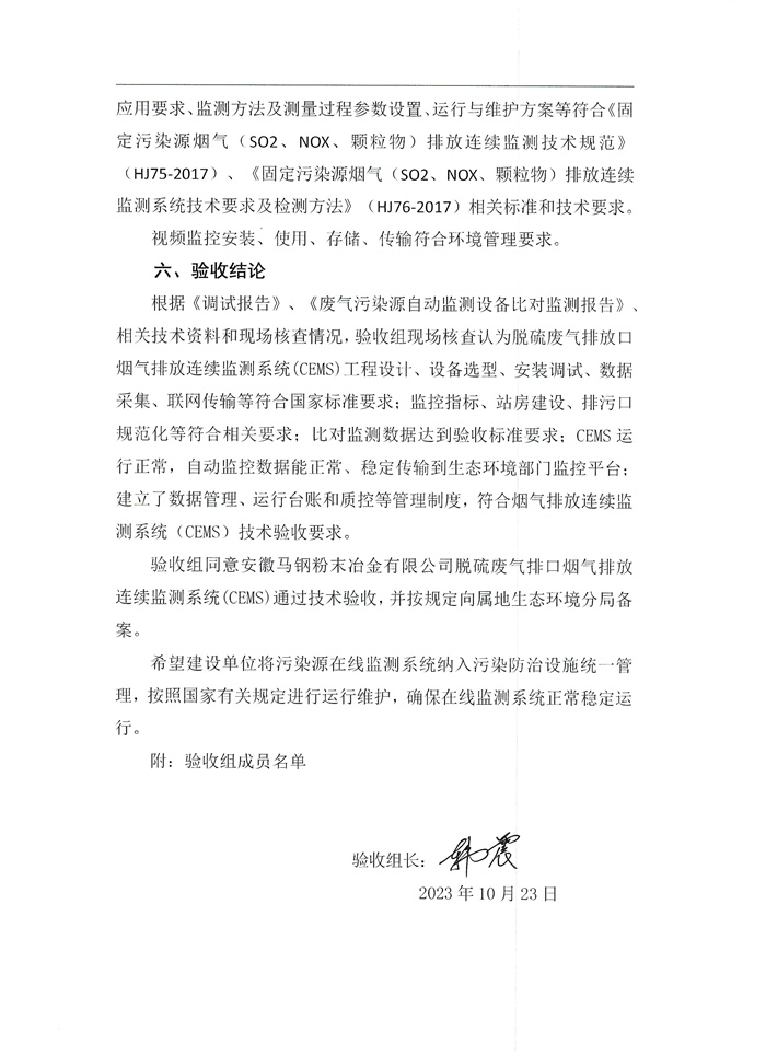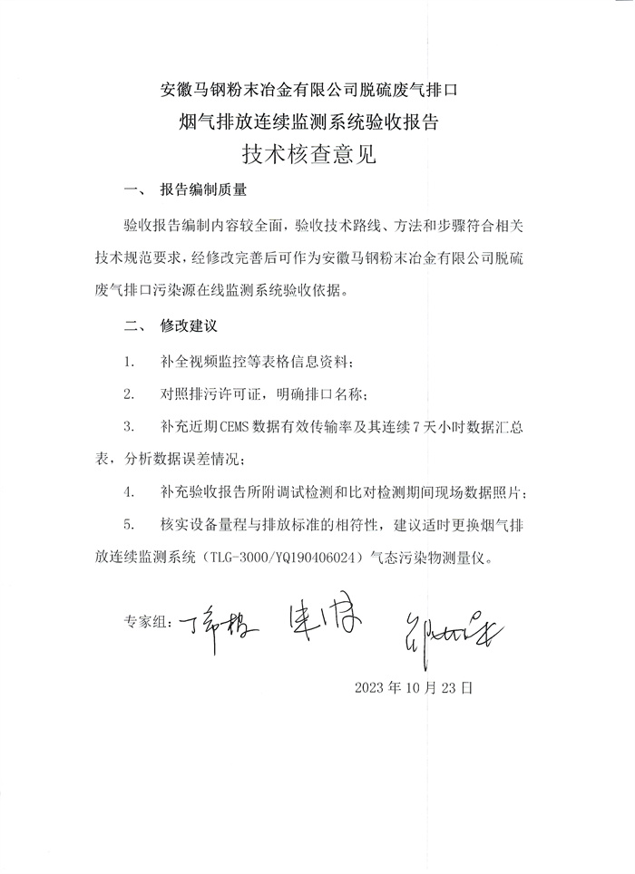 马钢粉末冶金有限公司脱硫废气排口—烟气排放连续监测系统技术验收意见