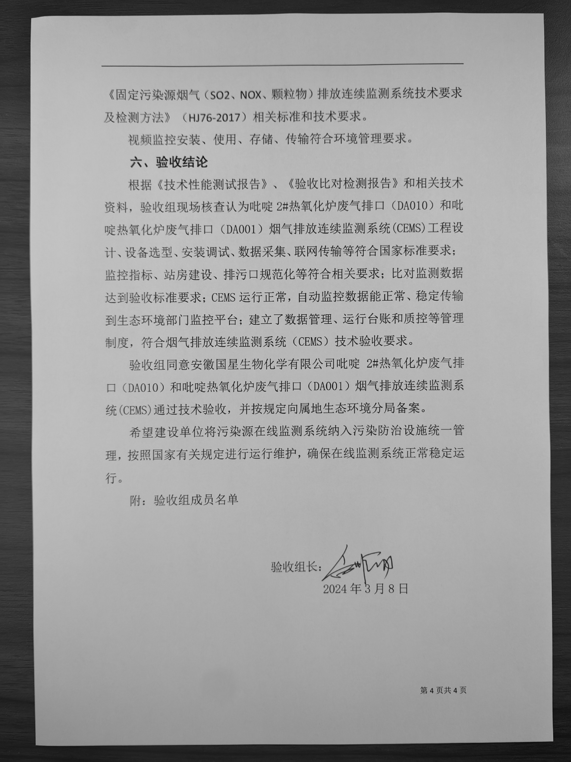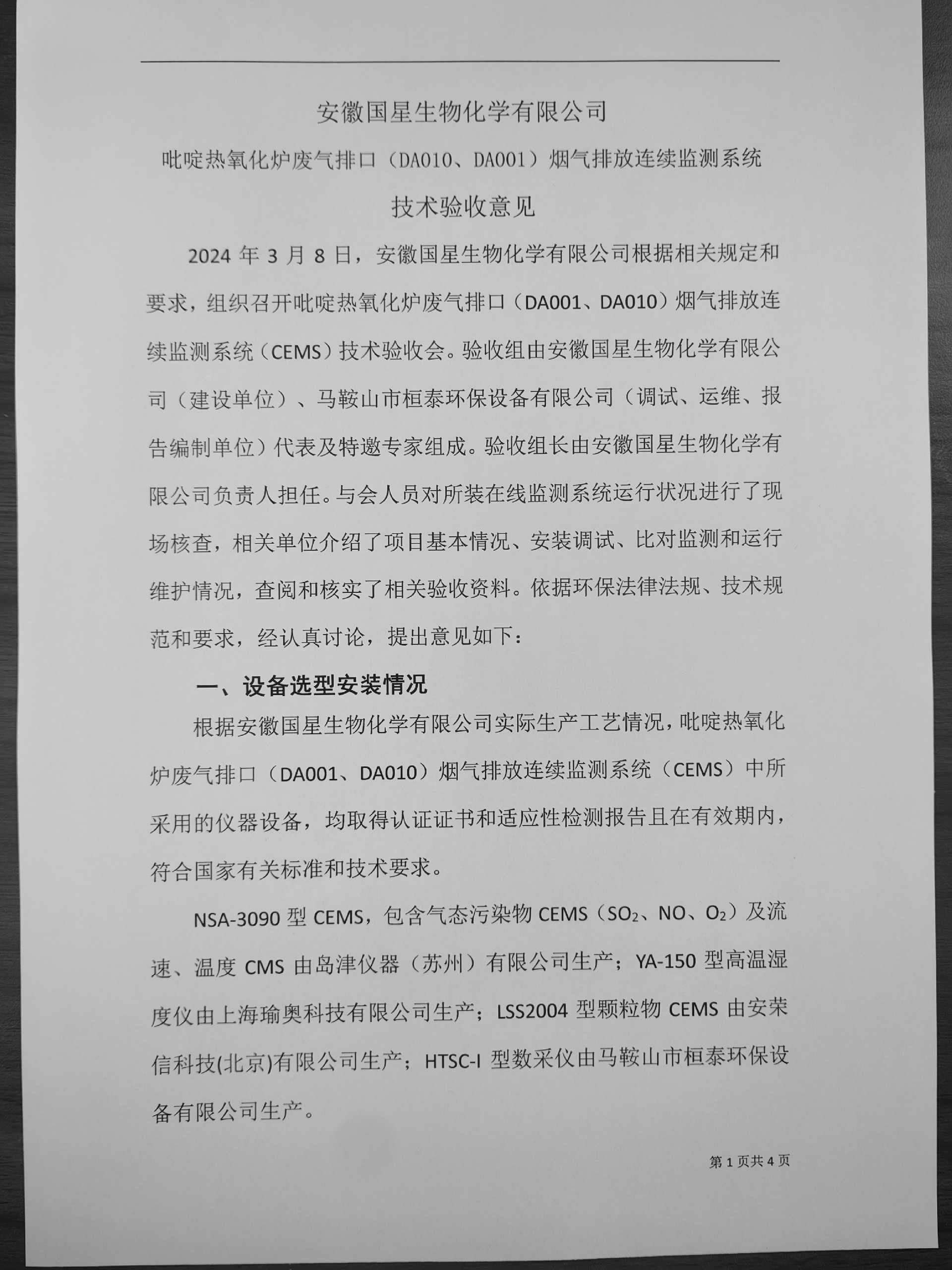 安徽国星生物化学有限公司吡啶热氧化炉废气排口烟气排放连续监测系统技术验收意见