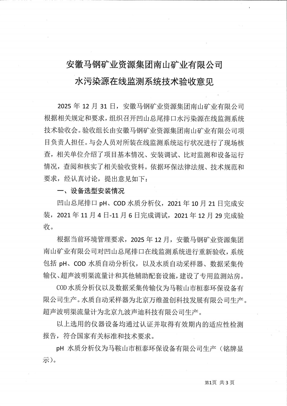 安徽马钢矿业资源集团南山矿业有限公司凹山总尾排口技术验收意见