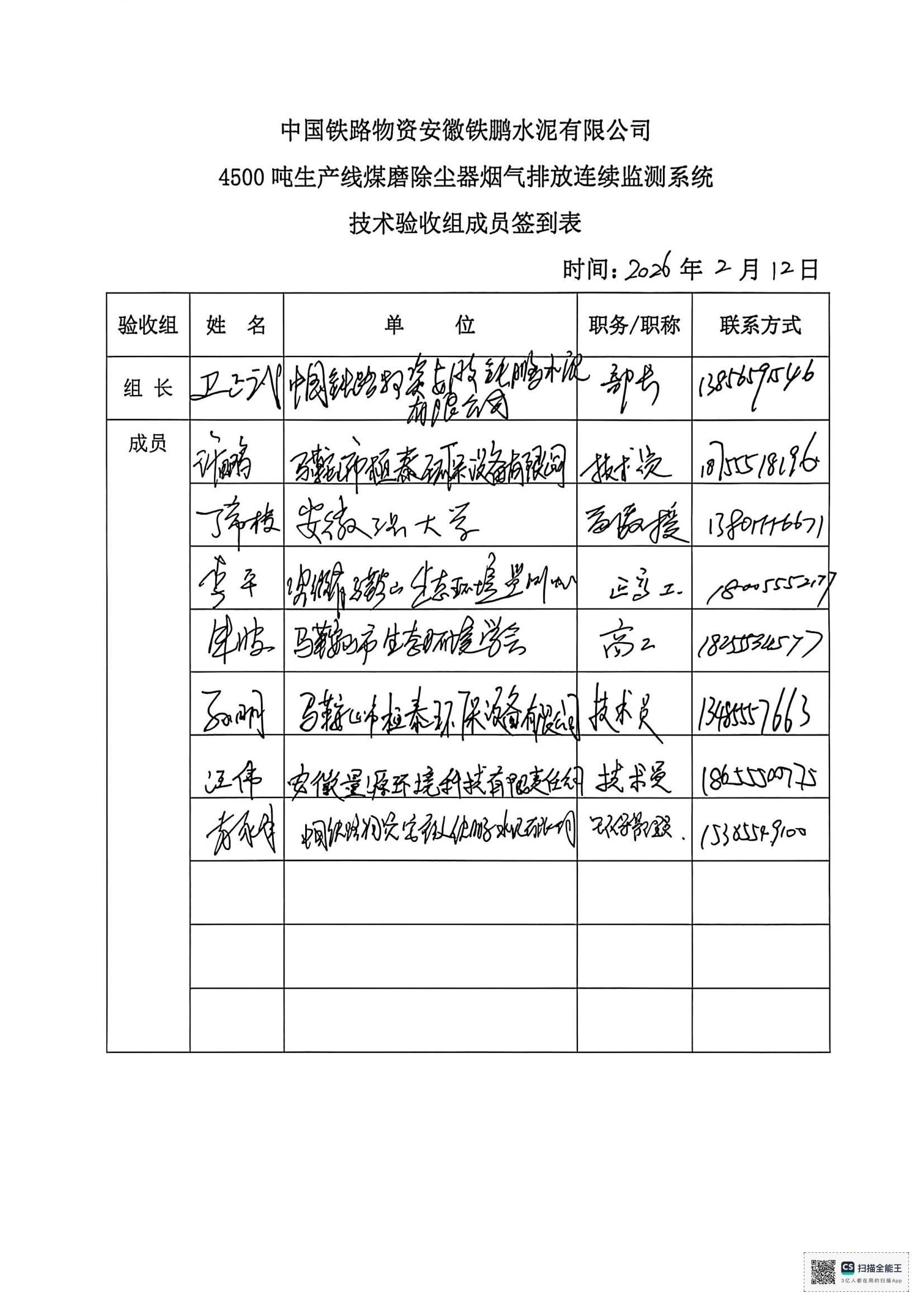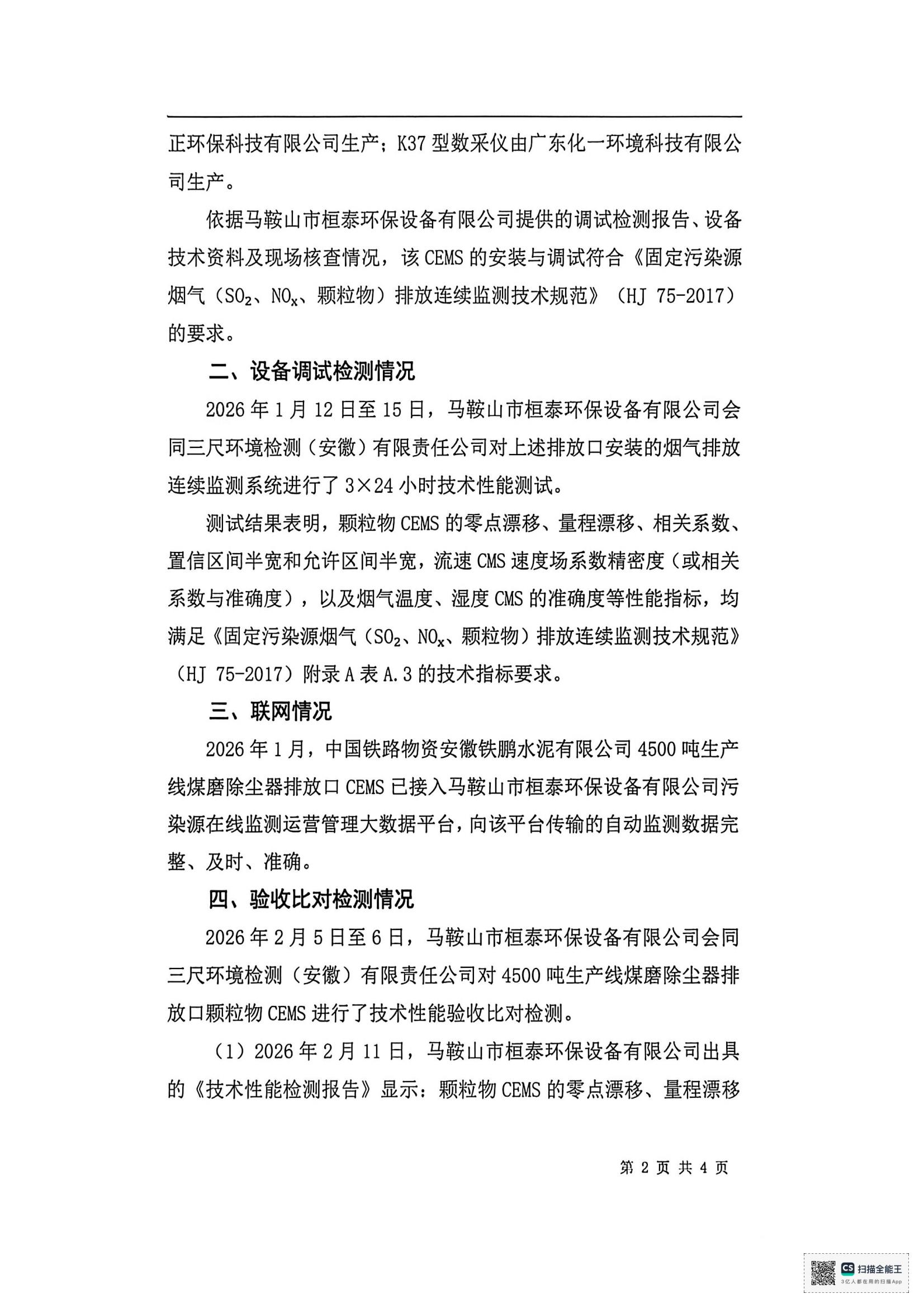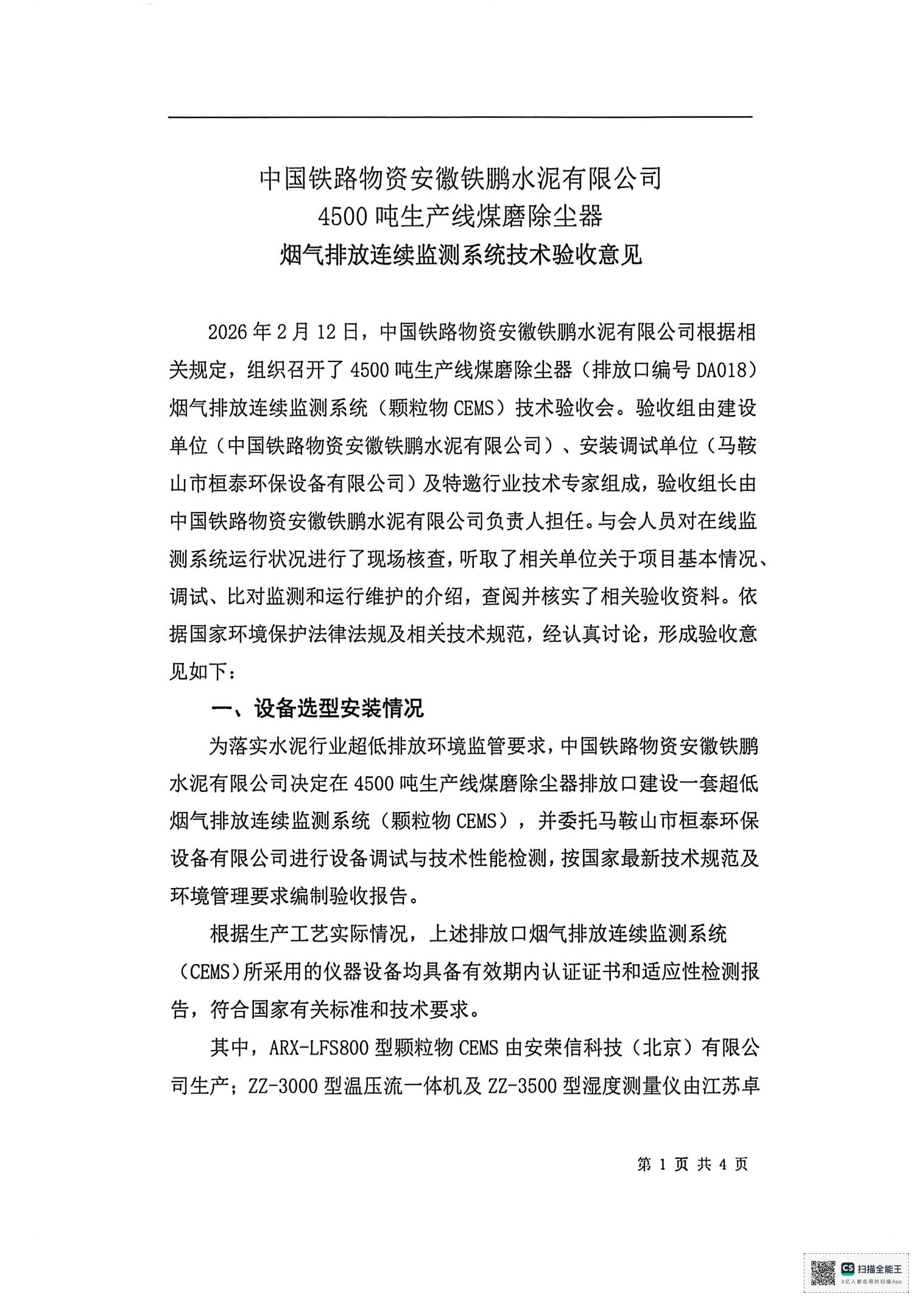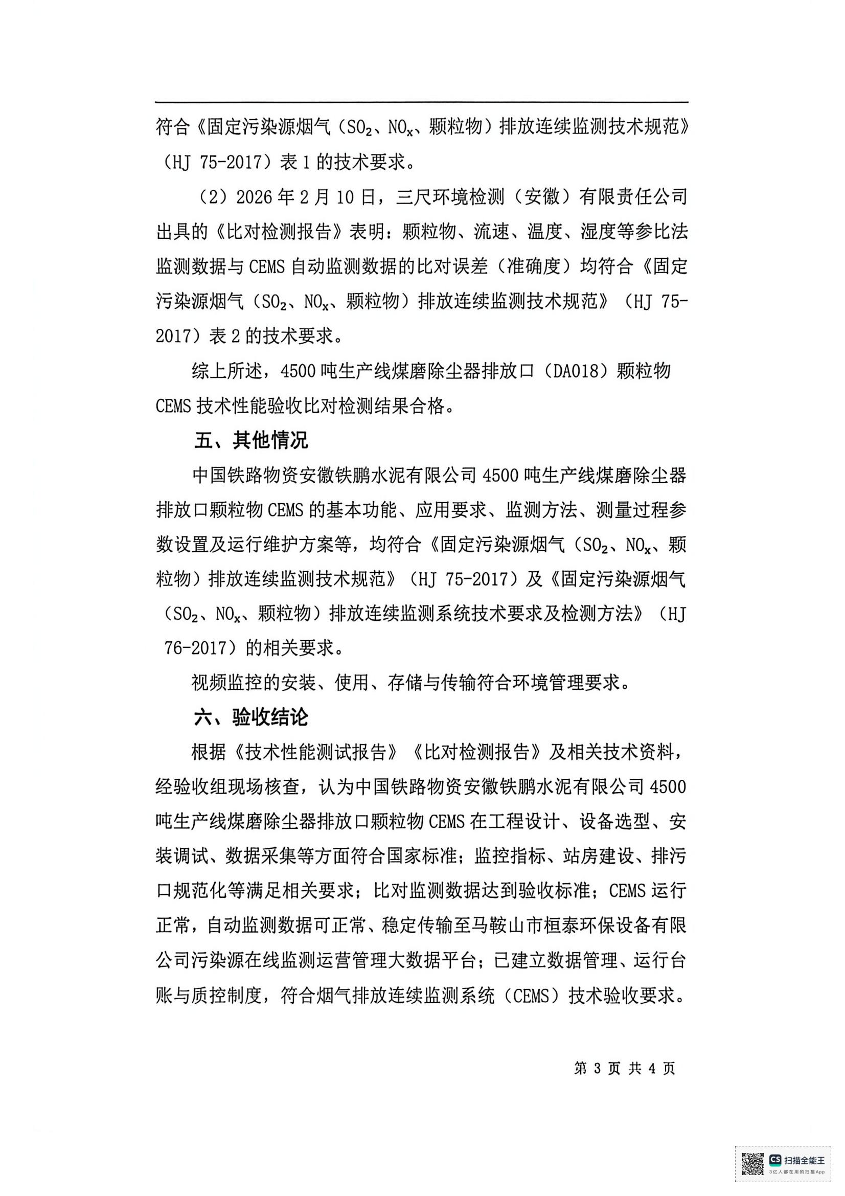 中国铁路物资安徽铁鹏水泥有限公司4号水泥磨收尘器烟气排放连续监测系统技术验收意见