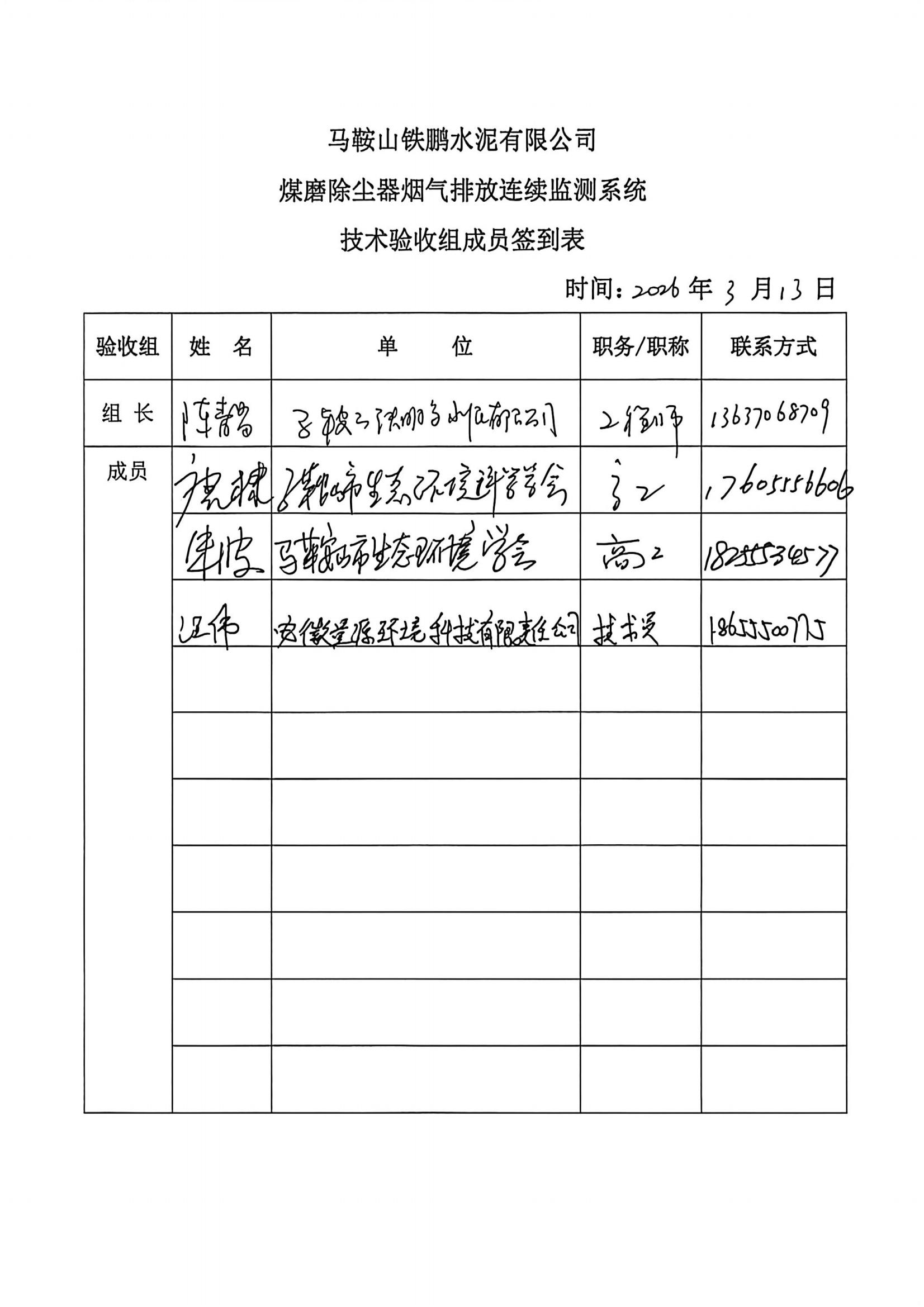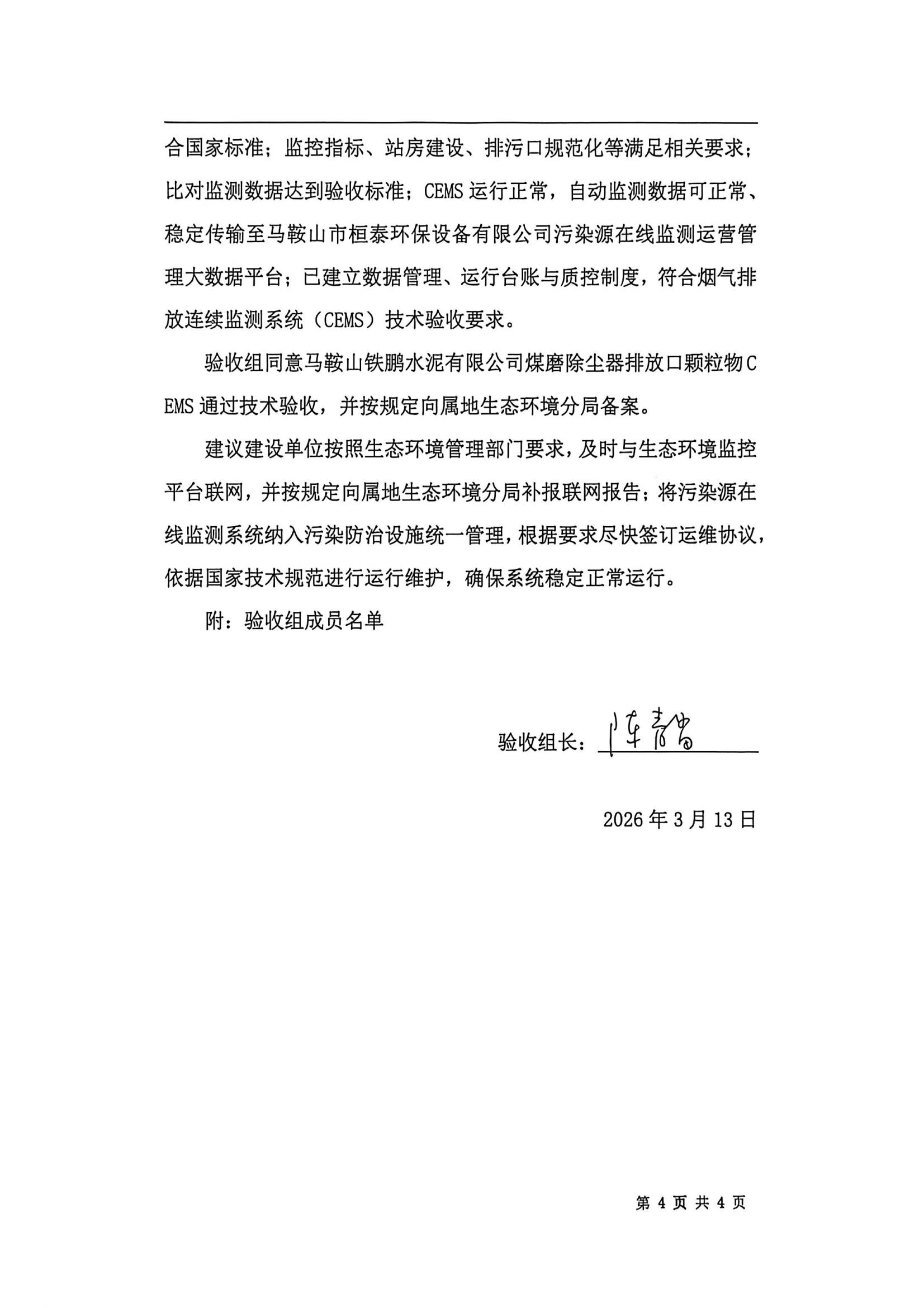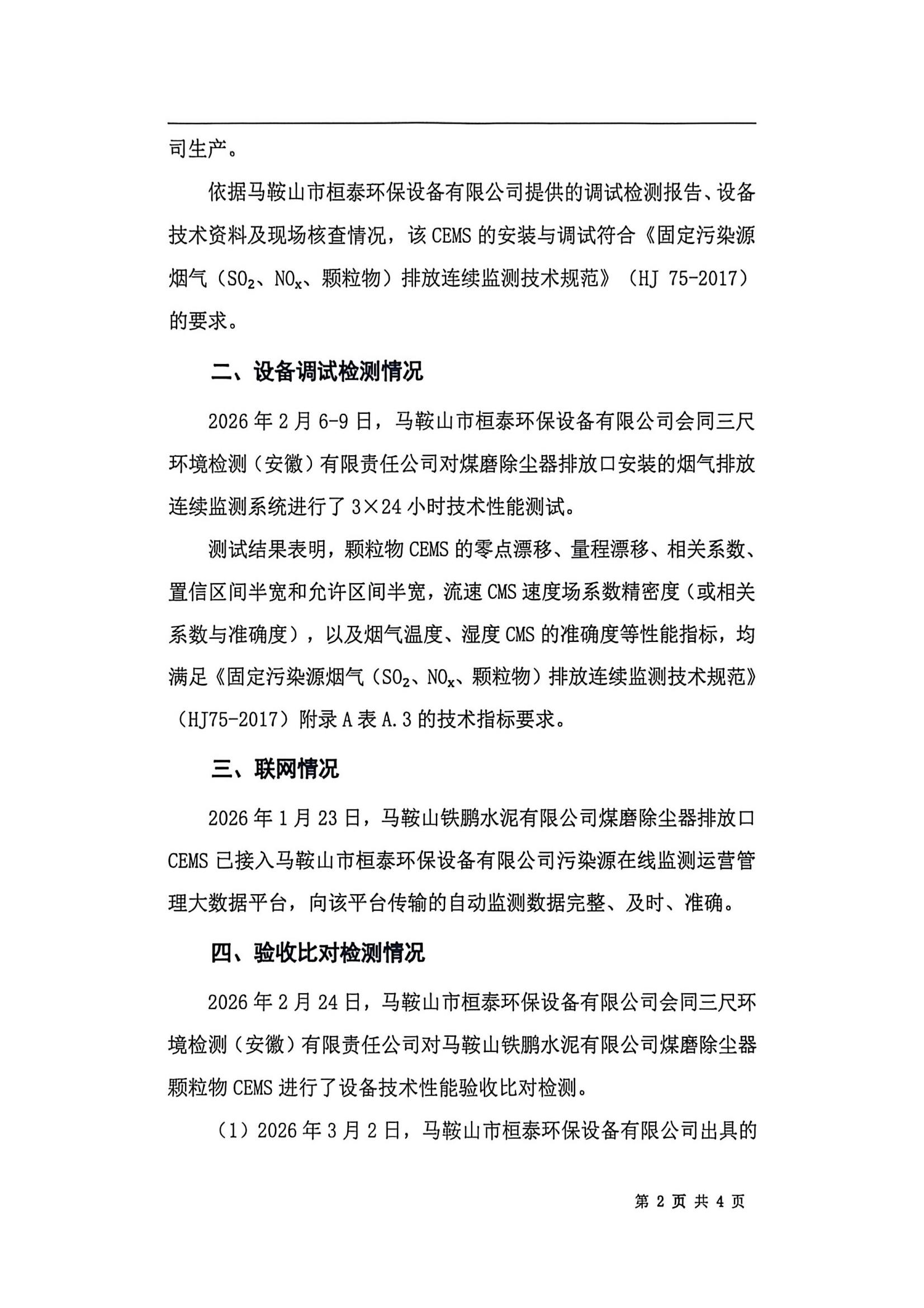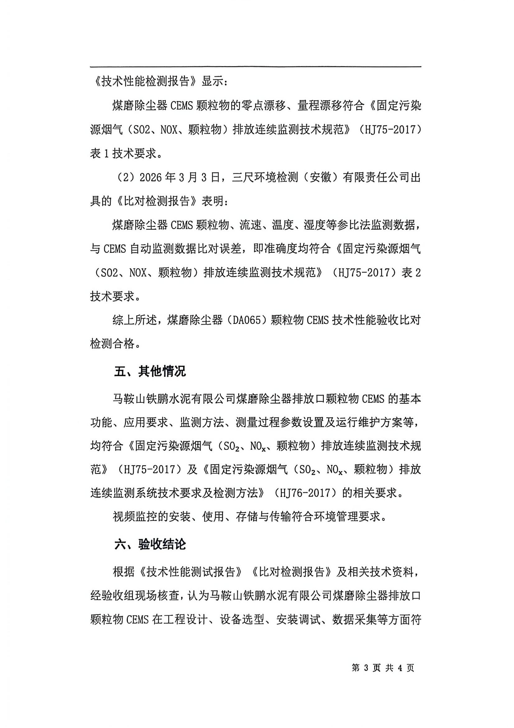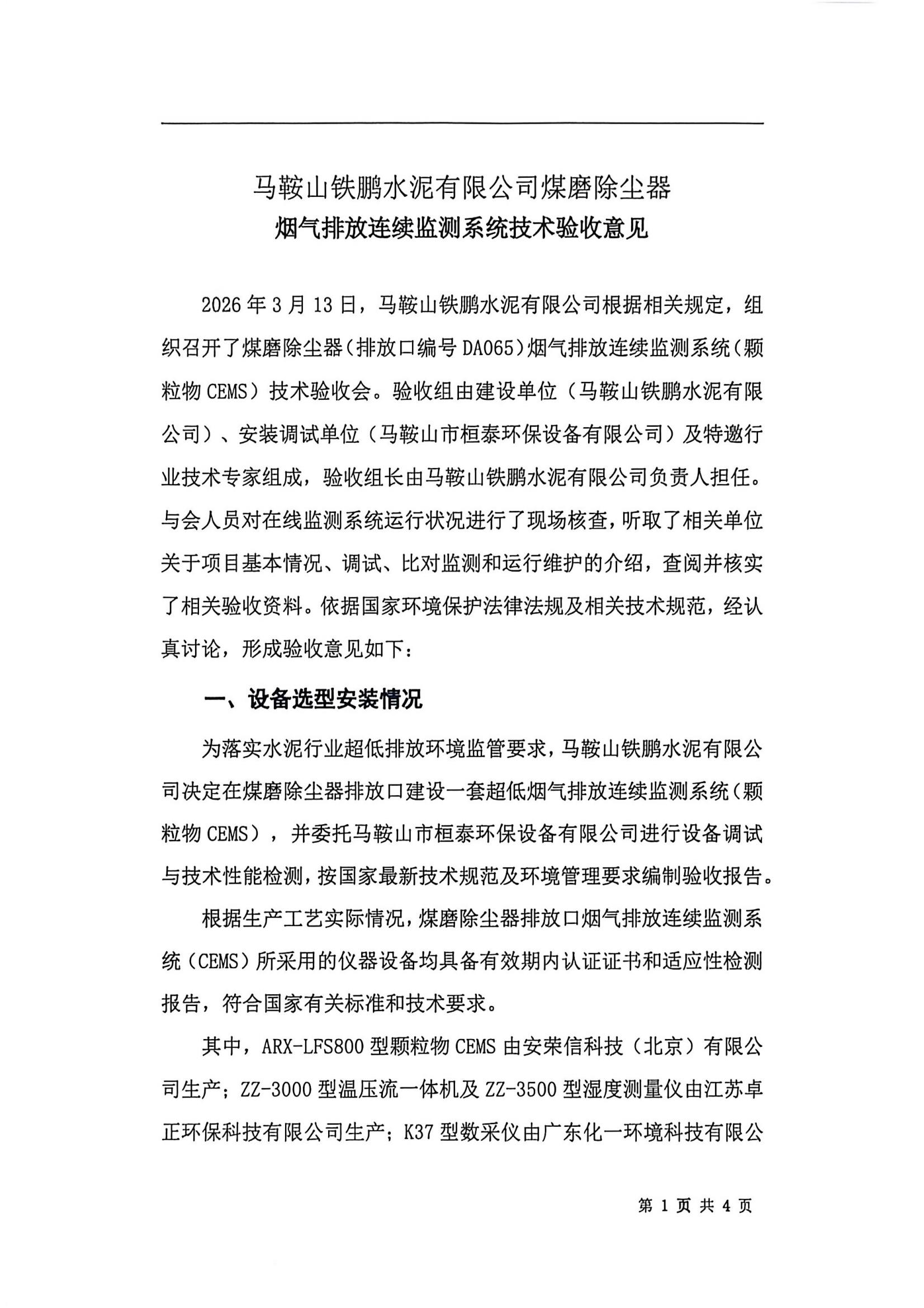 马鞍山铁鹏水泥有限公司煤磨除尘器烟气排放连续监测系统技术验收意见