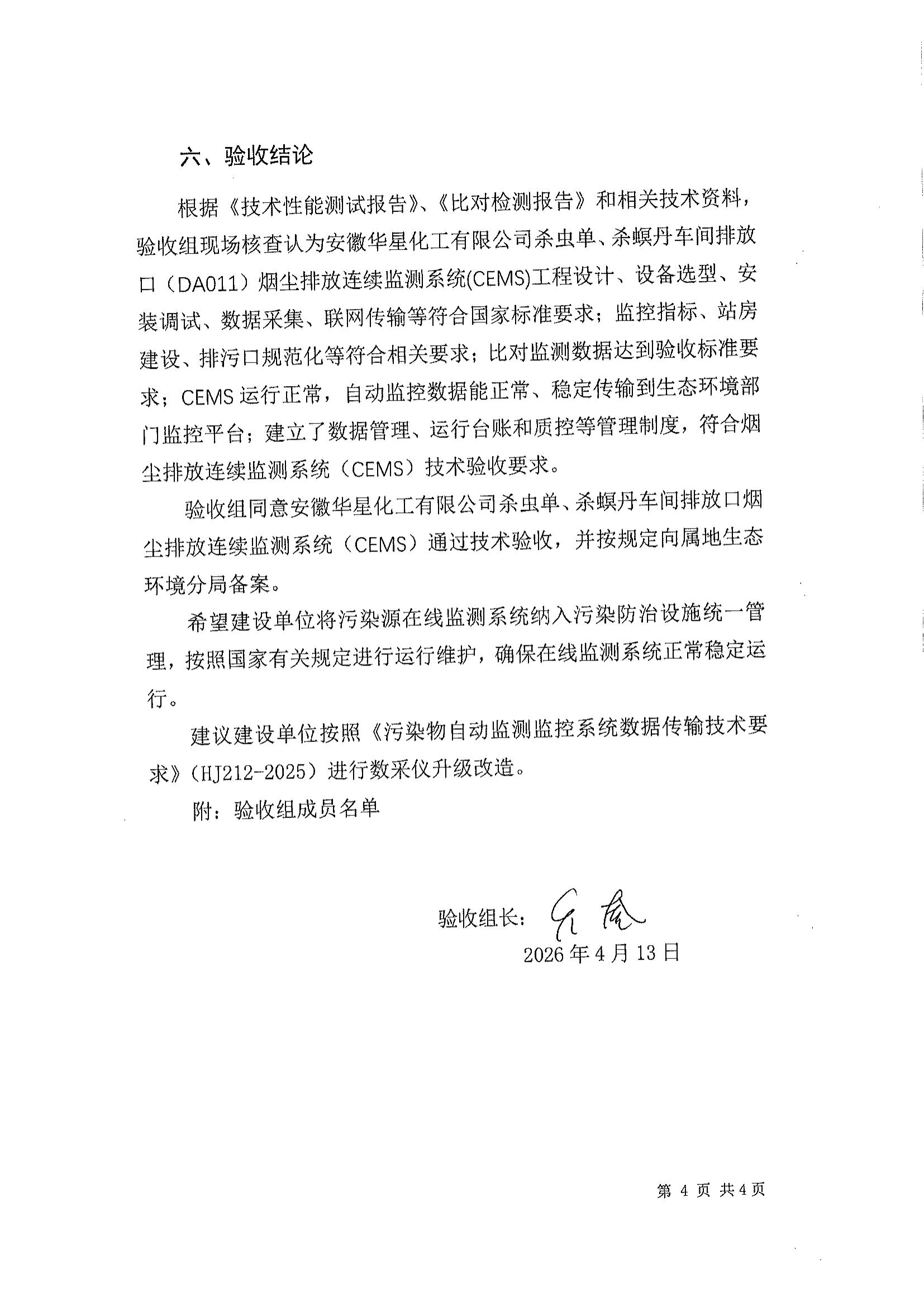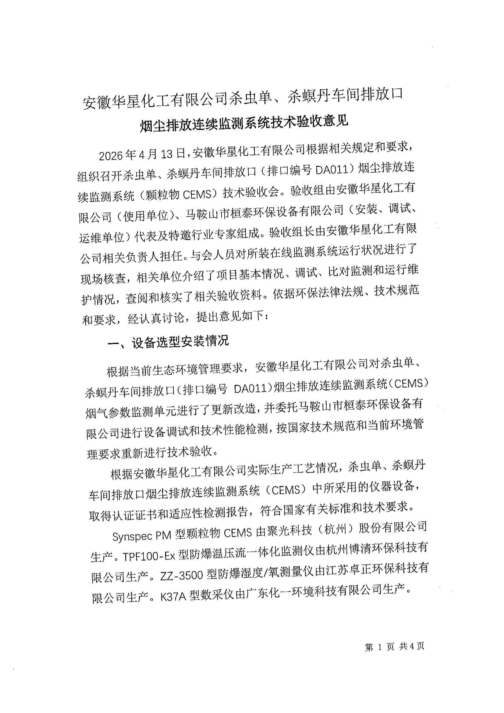 安徽华星化工有限公司杀虫单、杀螟丹车间排放口烟尘排放连续监测系统技术验收意见