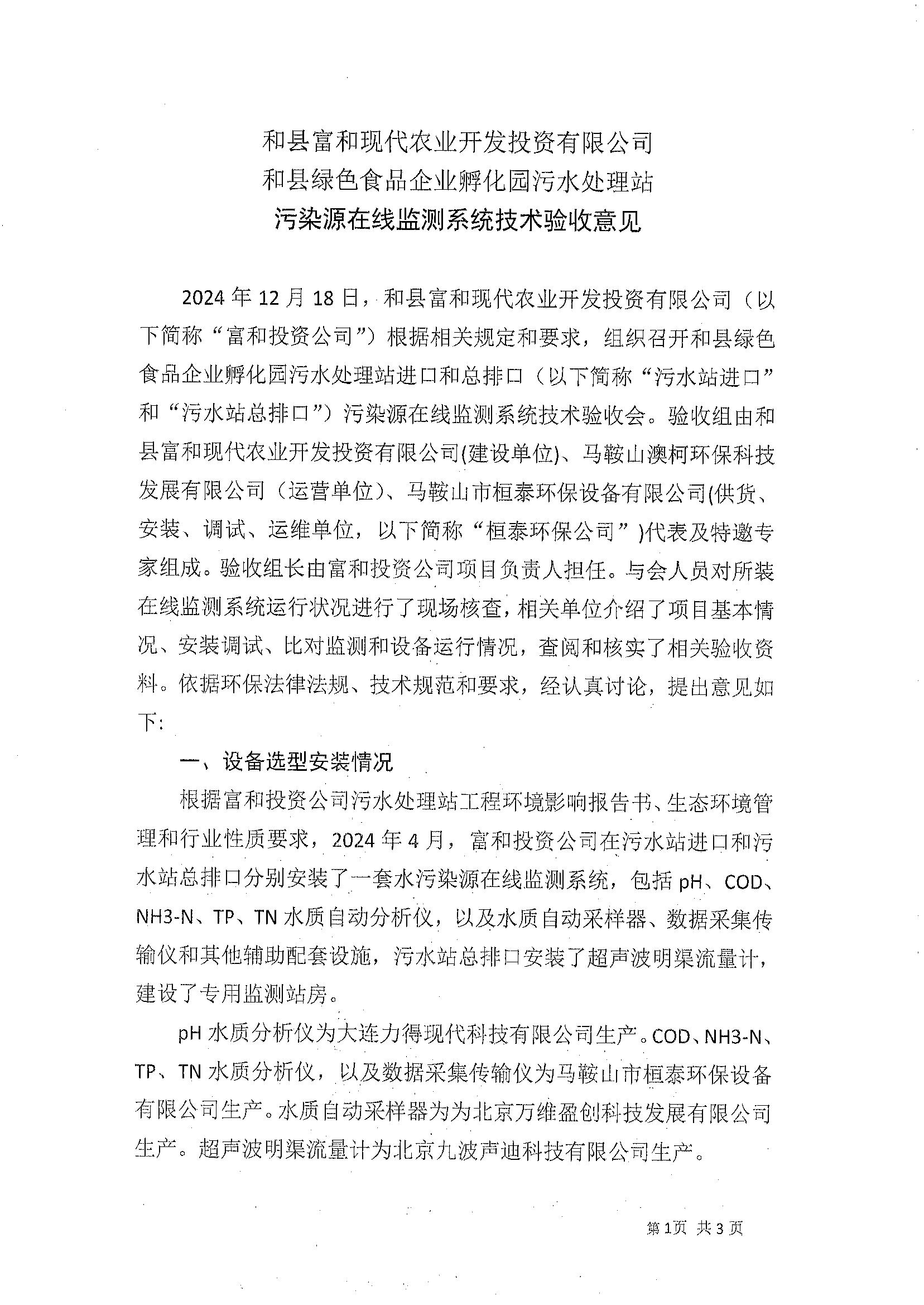 和县富和现代农业开发投资有限公司和县绿色食品企业孵化园污水处理站污染源在线监测系统技术验收意见 (1