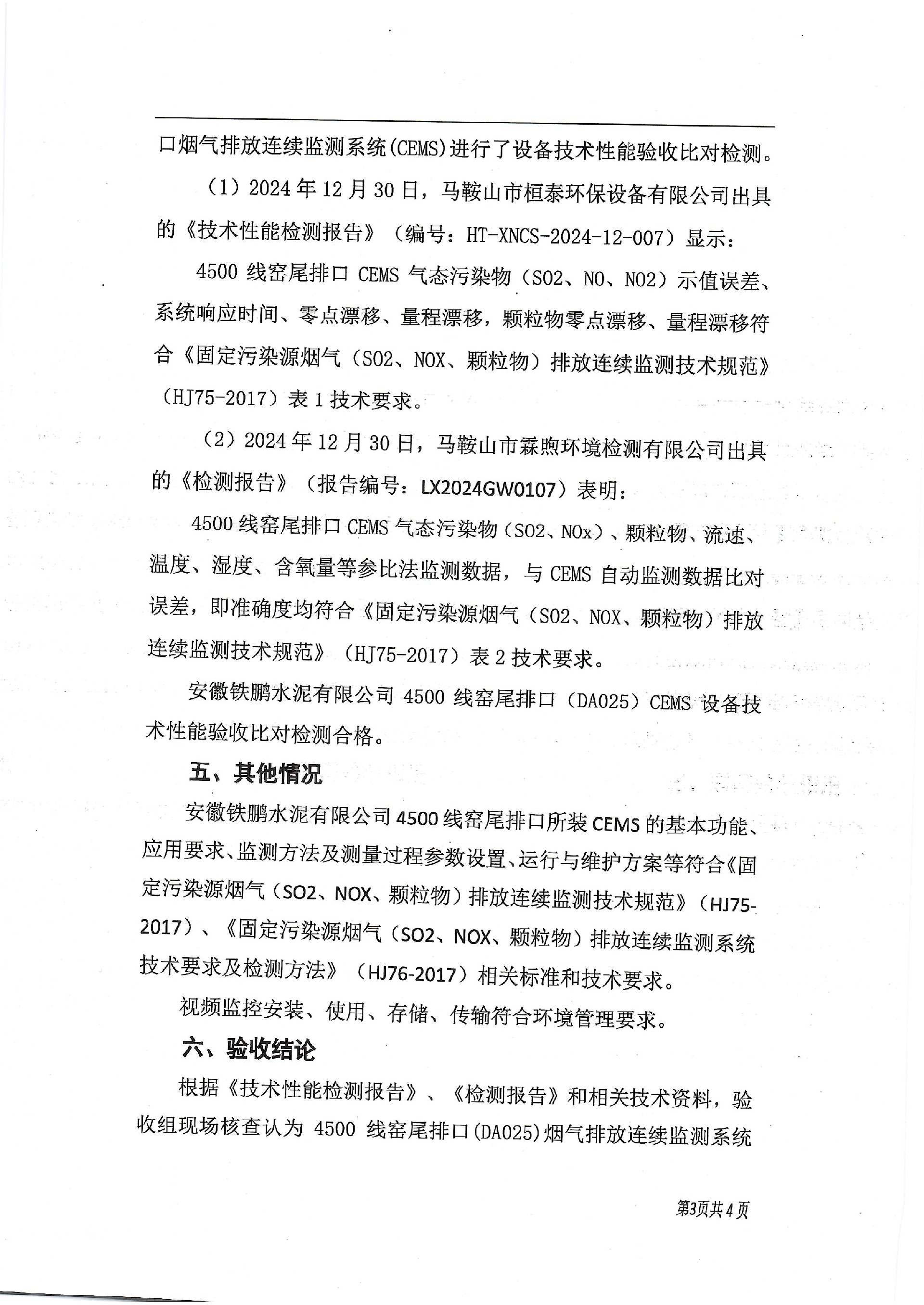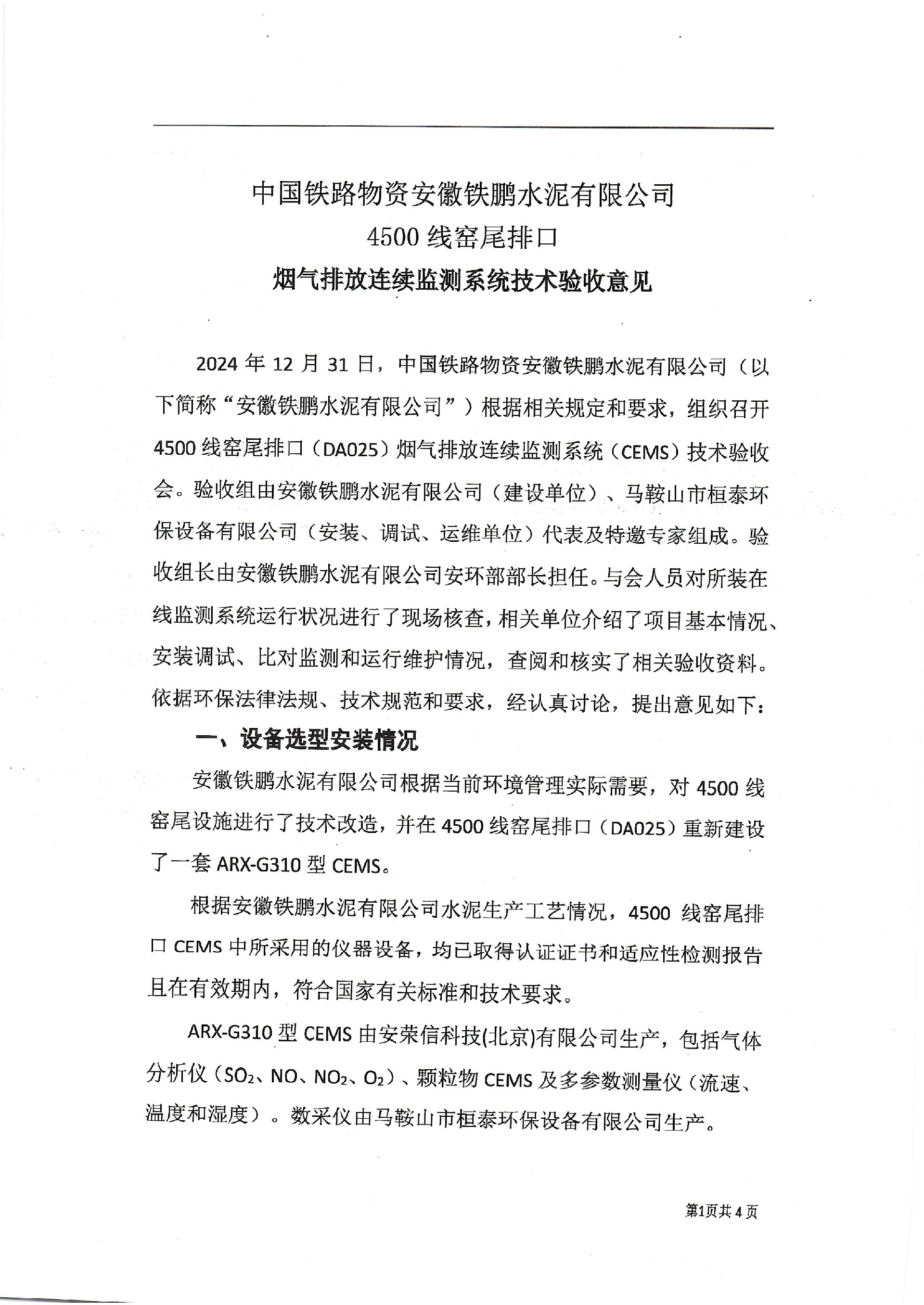 中国铁路物资安徽铁鹏水泥有限公司4500线窑尾排口烟气排放连续监测系统技术验收意见