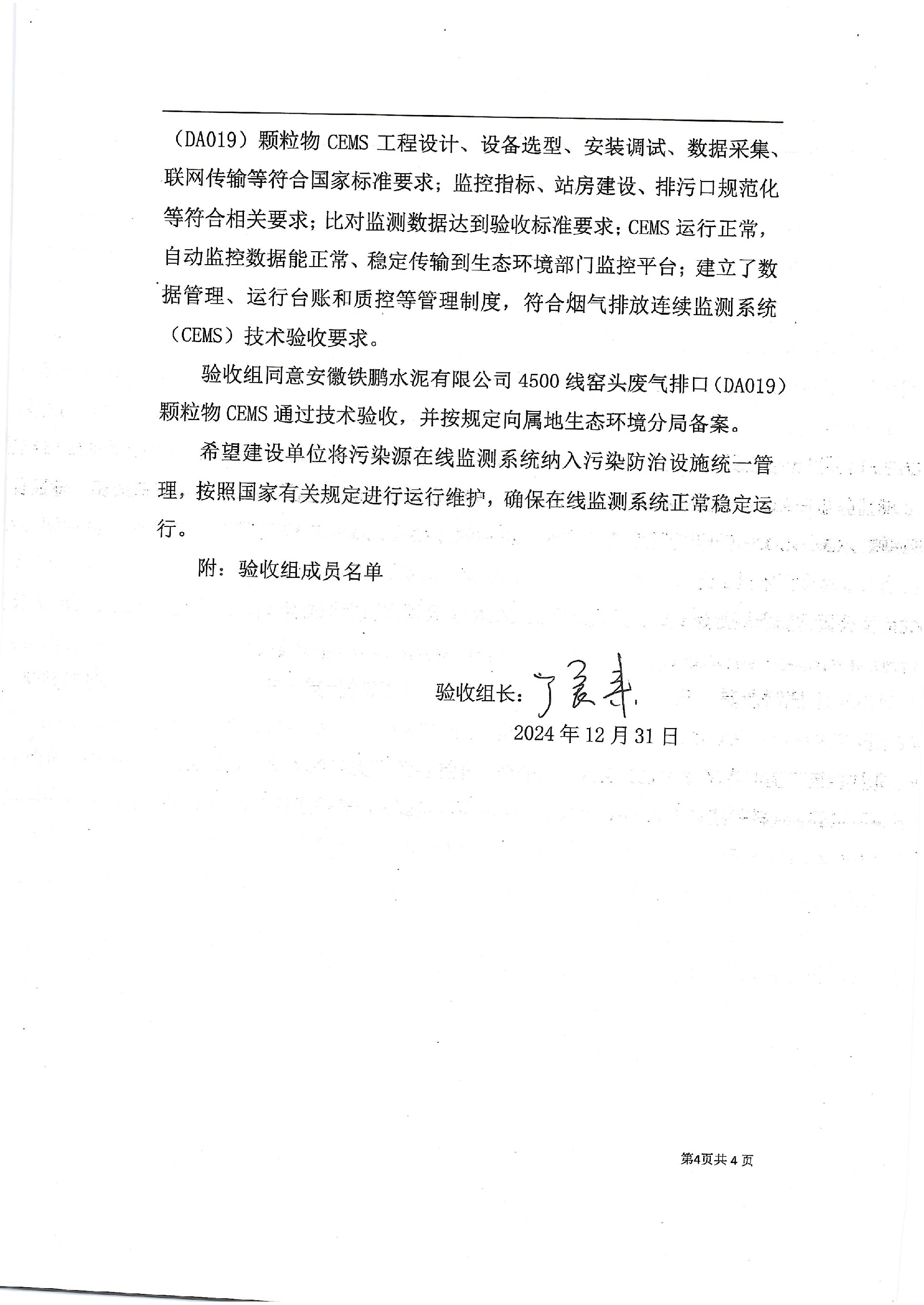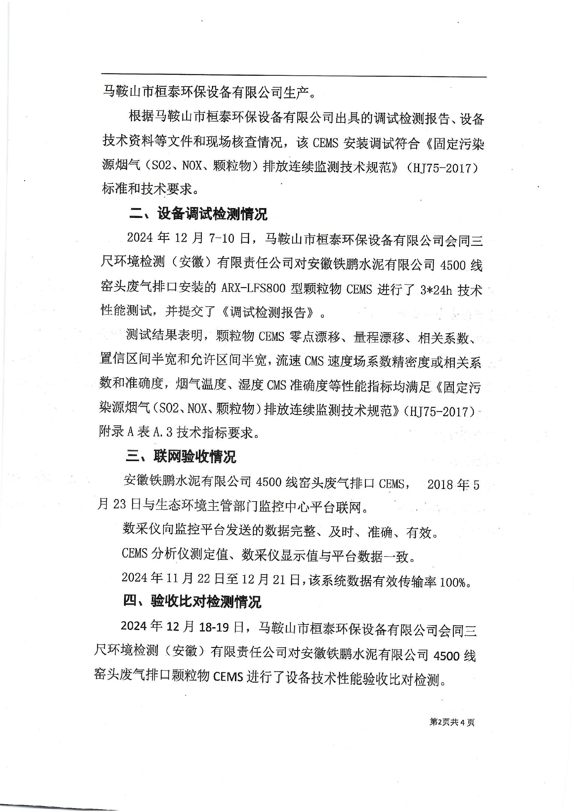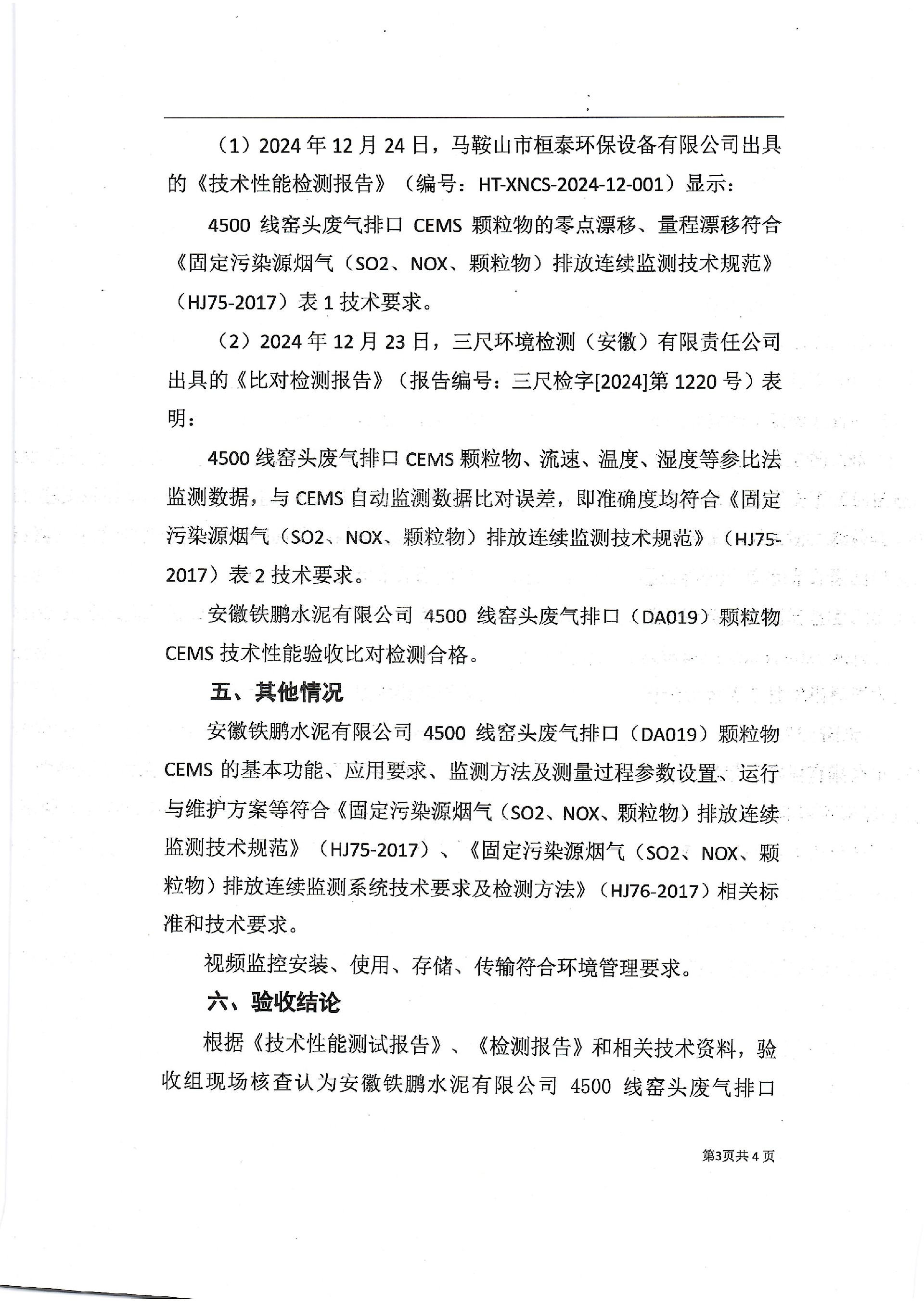 中国铁路物资安徽铁鹏水泥有限公司4500线窑尾排口烟气排放连续监测系统技术验收意见