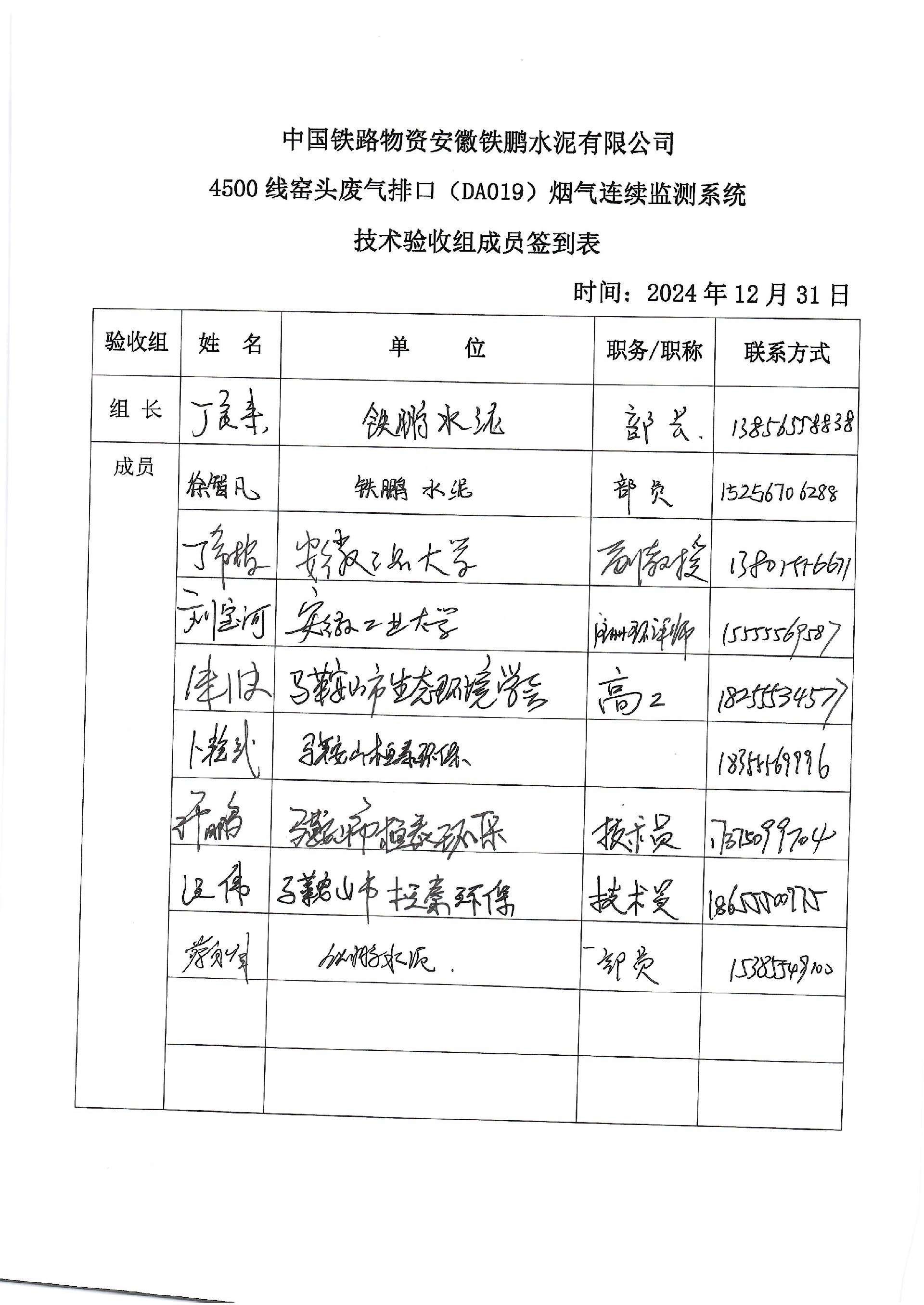 中国铁路物资安徽铁鹏水泥有限公司4500线窑头废气排口烟气排放连续监测系统技术验收意见