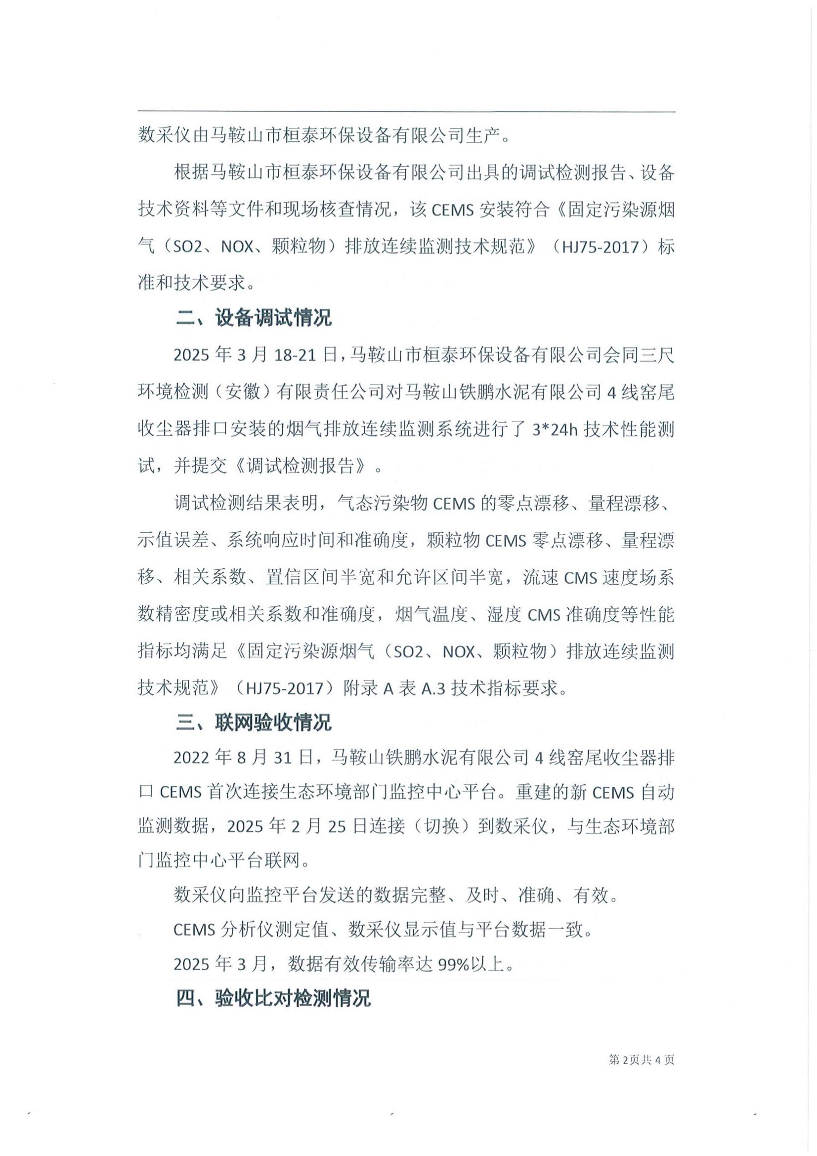 马鞍山铁鹏水泥有限公司4线窑尾收尘器排口烟气排放连续监测系统技术验收意见