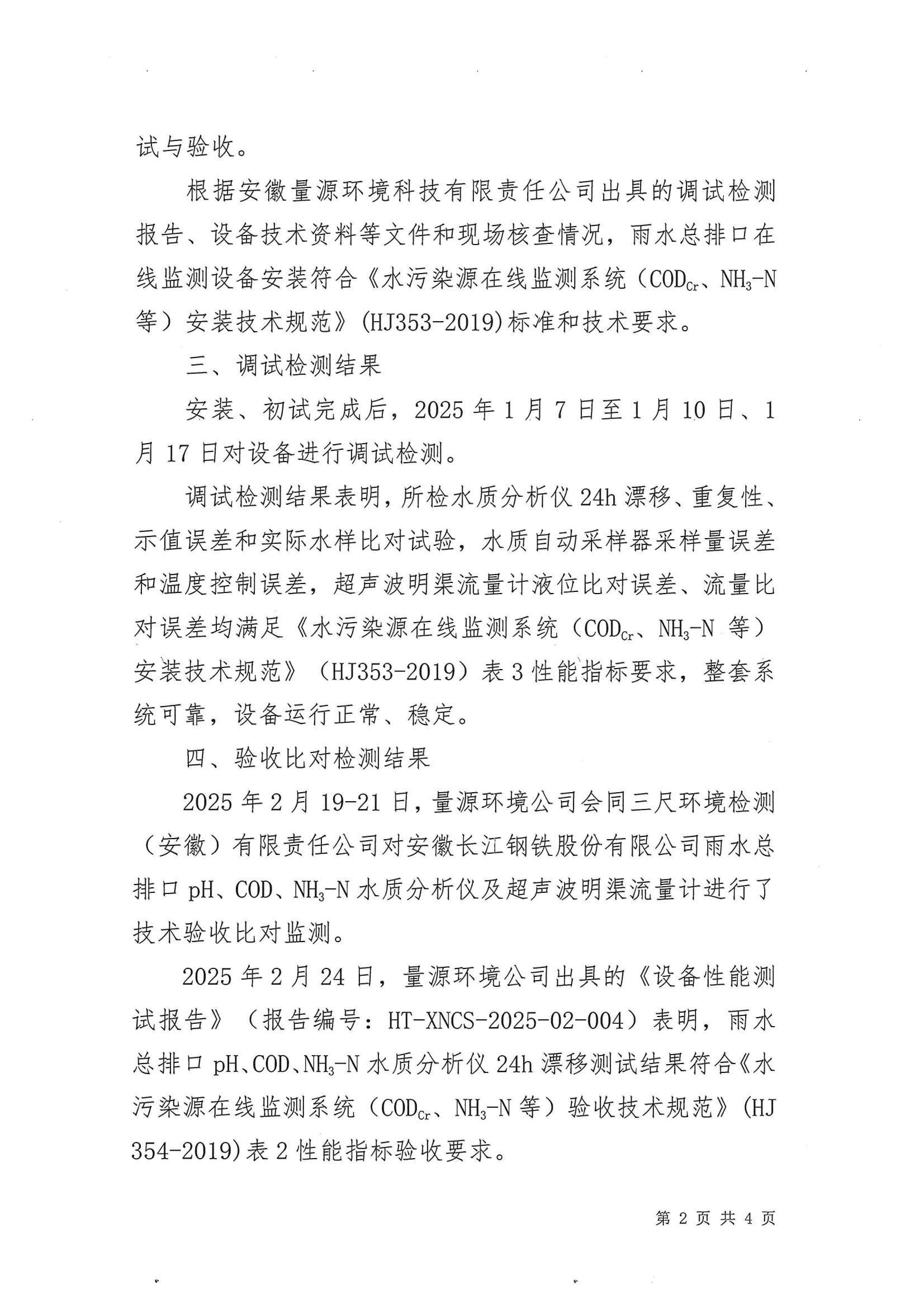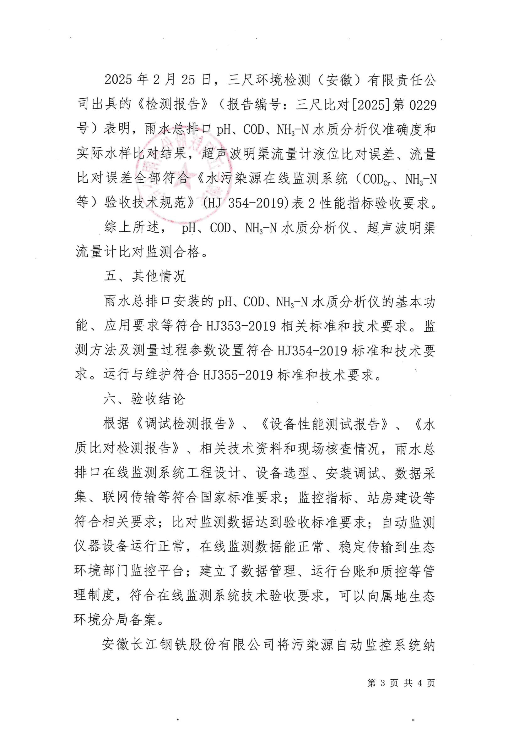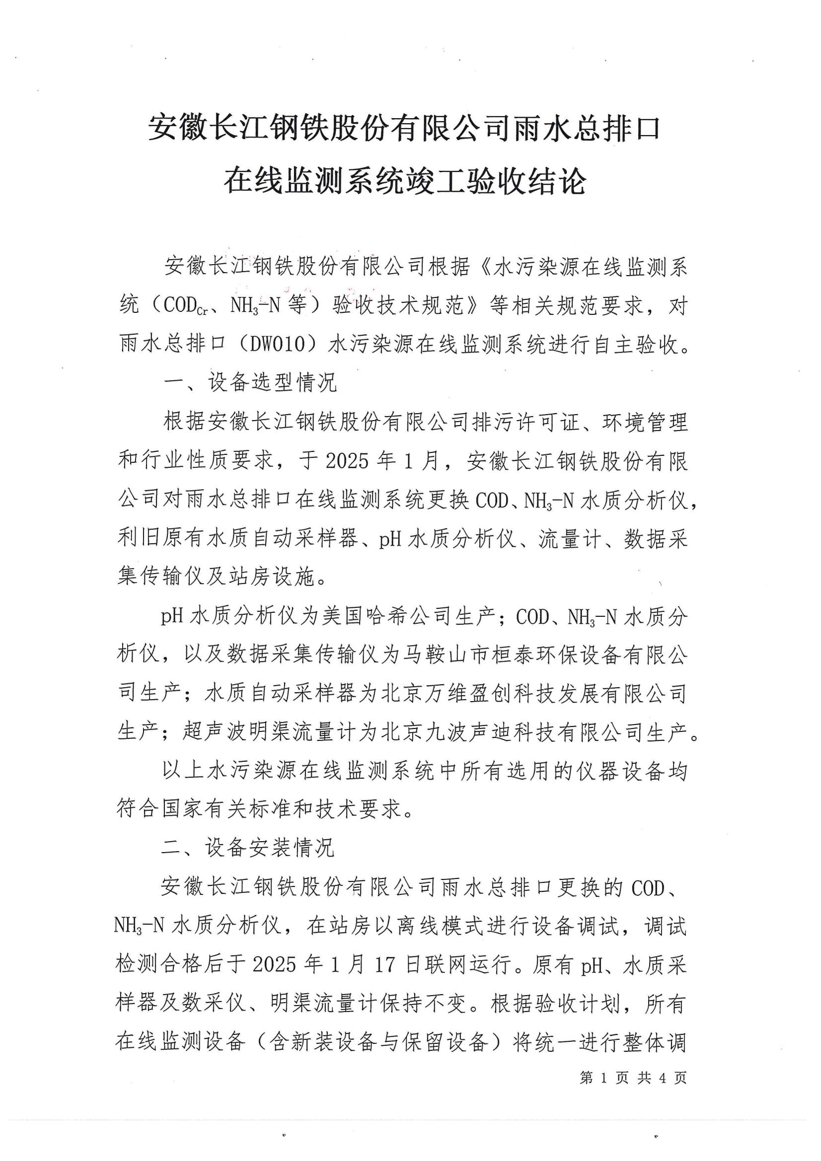 安徽长江钢铁股份有限公司雨水总排口在线监测系统竣工验收结论