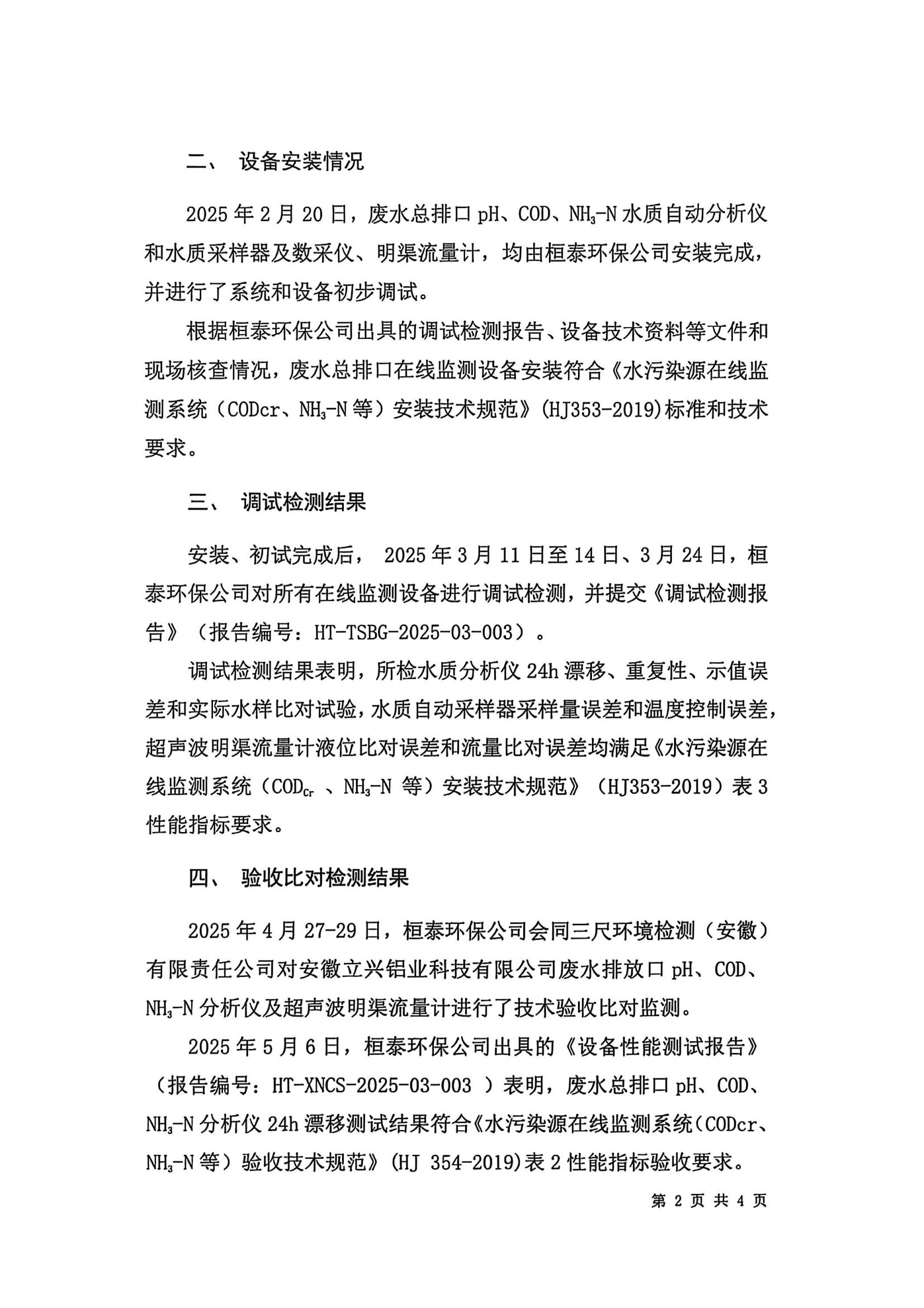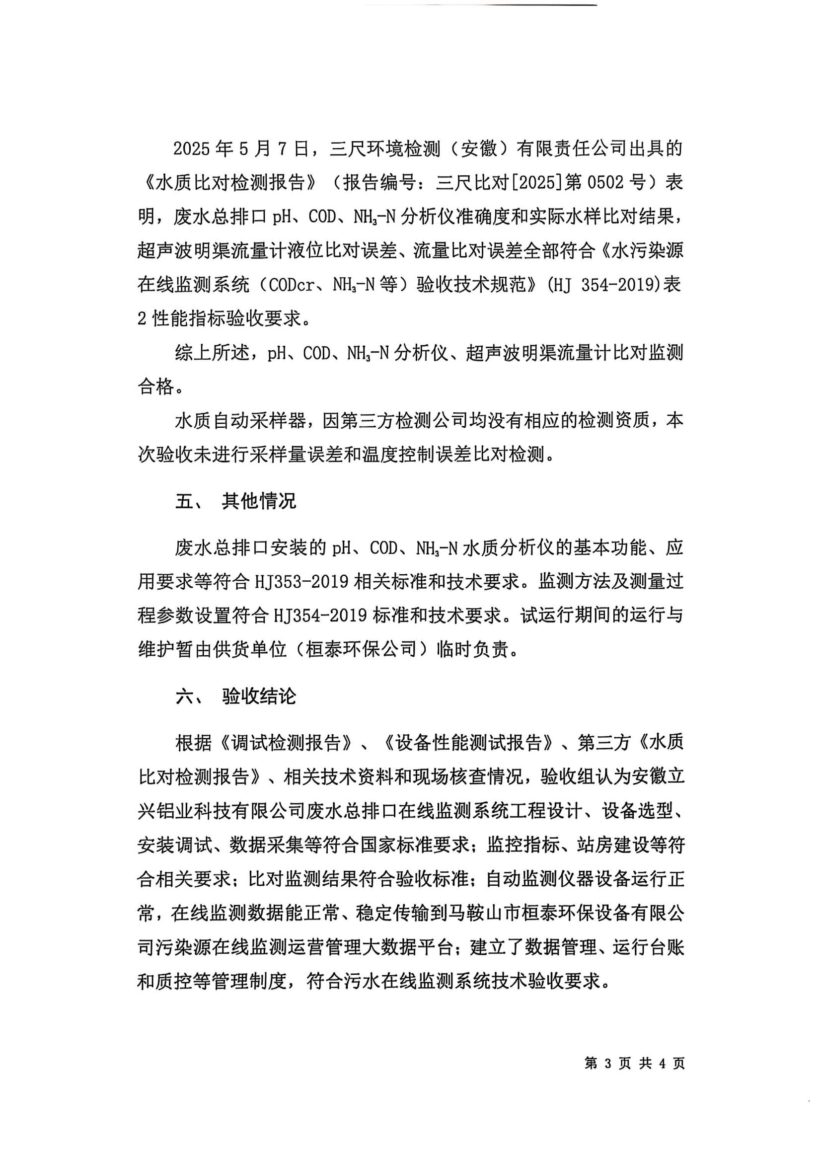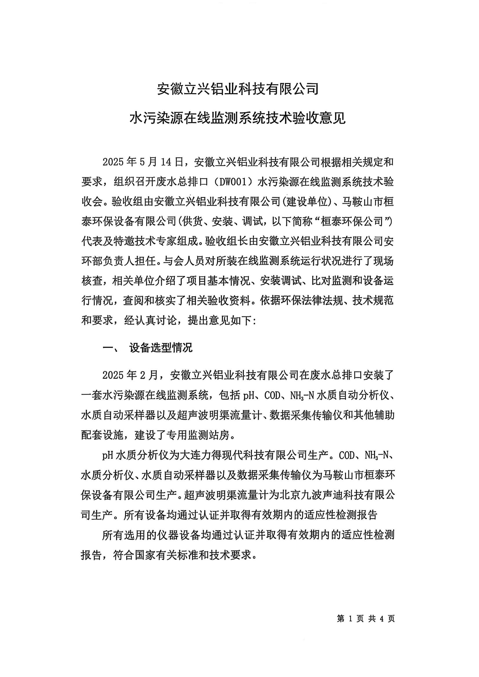 安徽立兴铝业科技有限公司水污染源在线监测系统技术验收意见