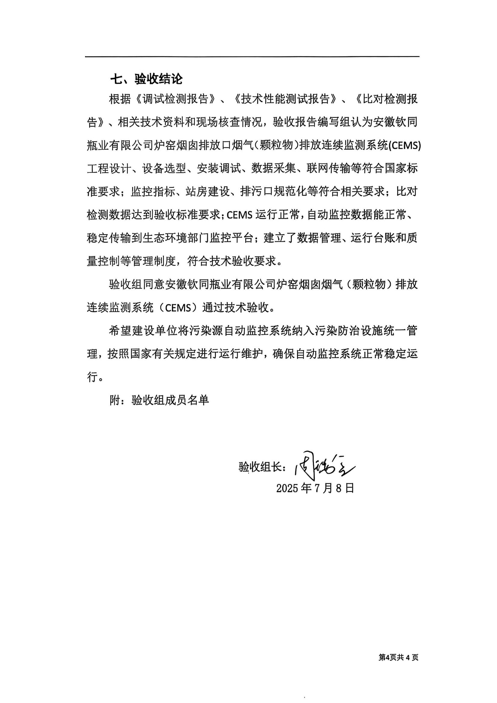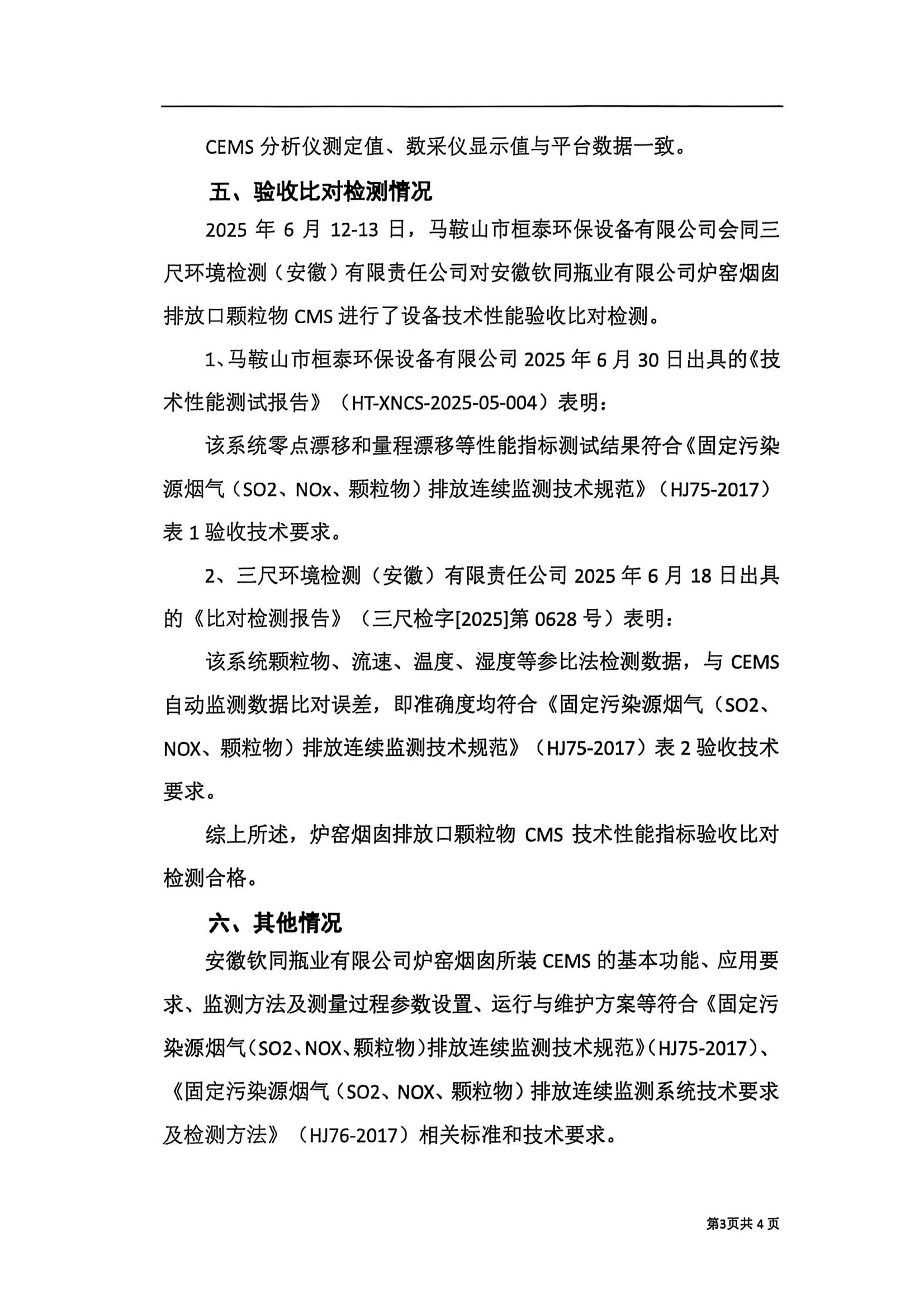 安徽钦同瓶业有限公司炉窑烟囱烟气(颗粒物)排放连续监测系统技术验收意见