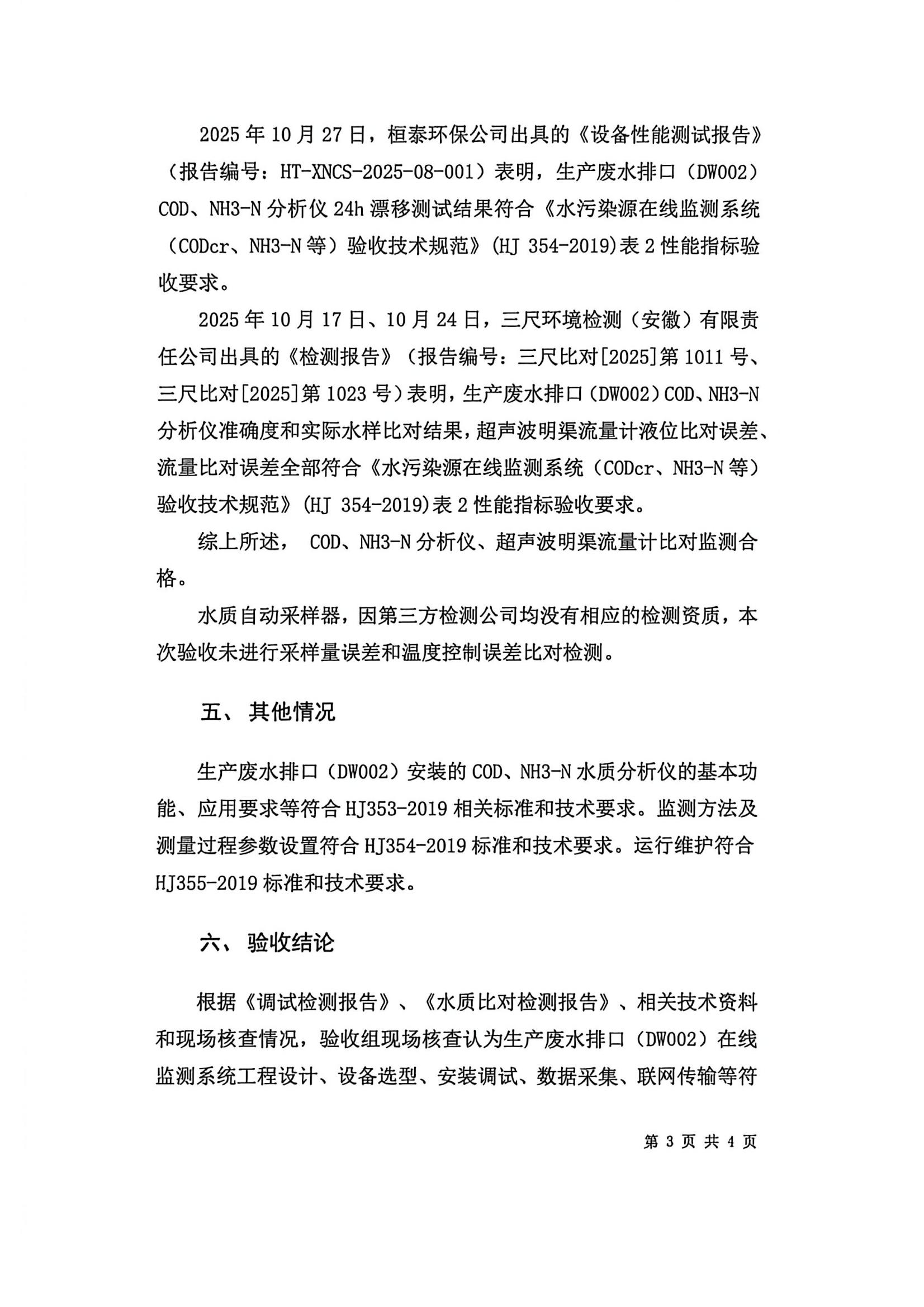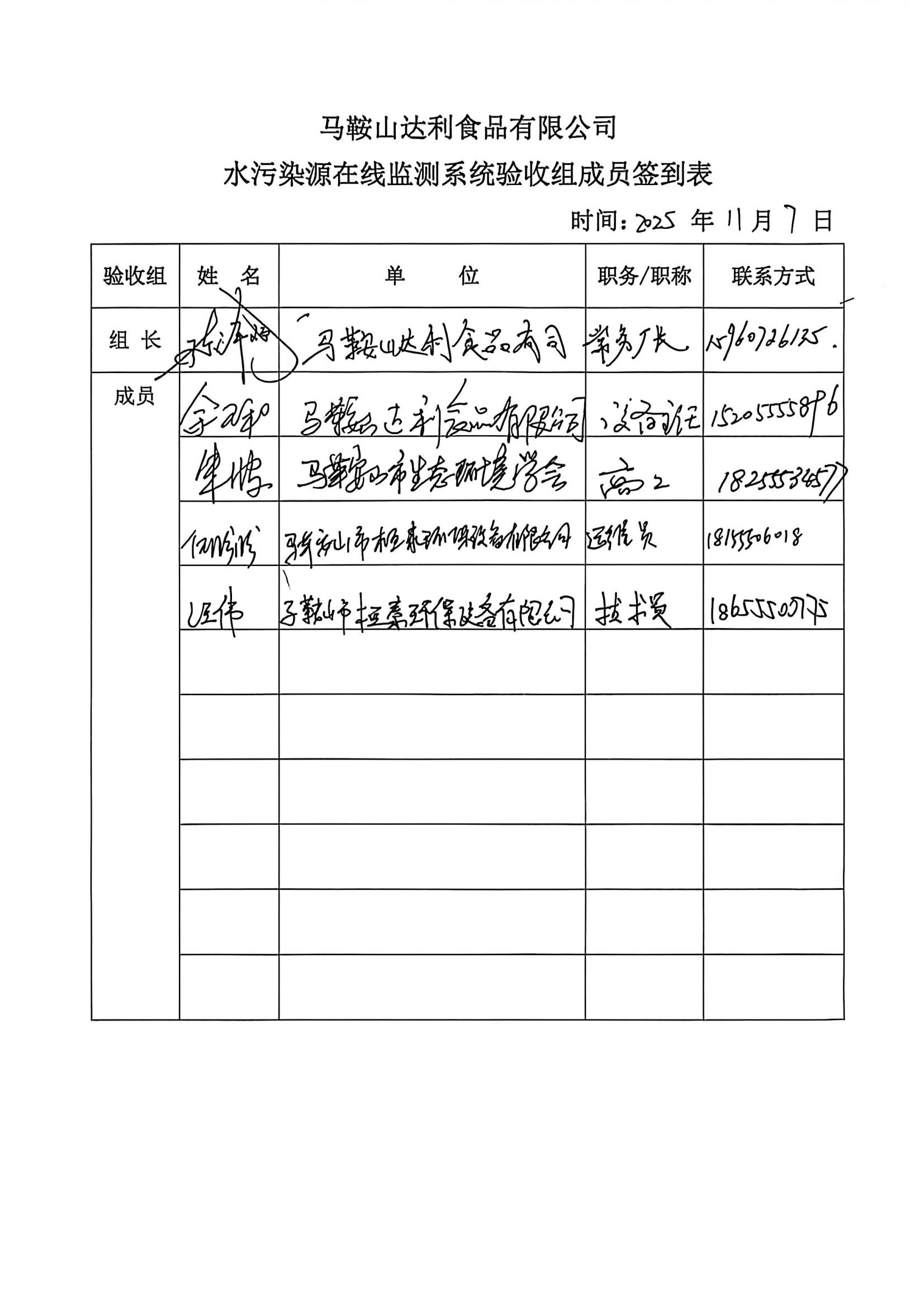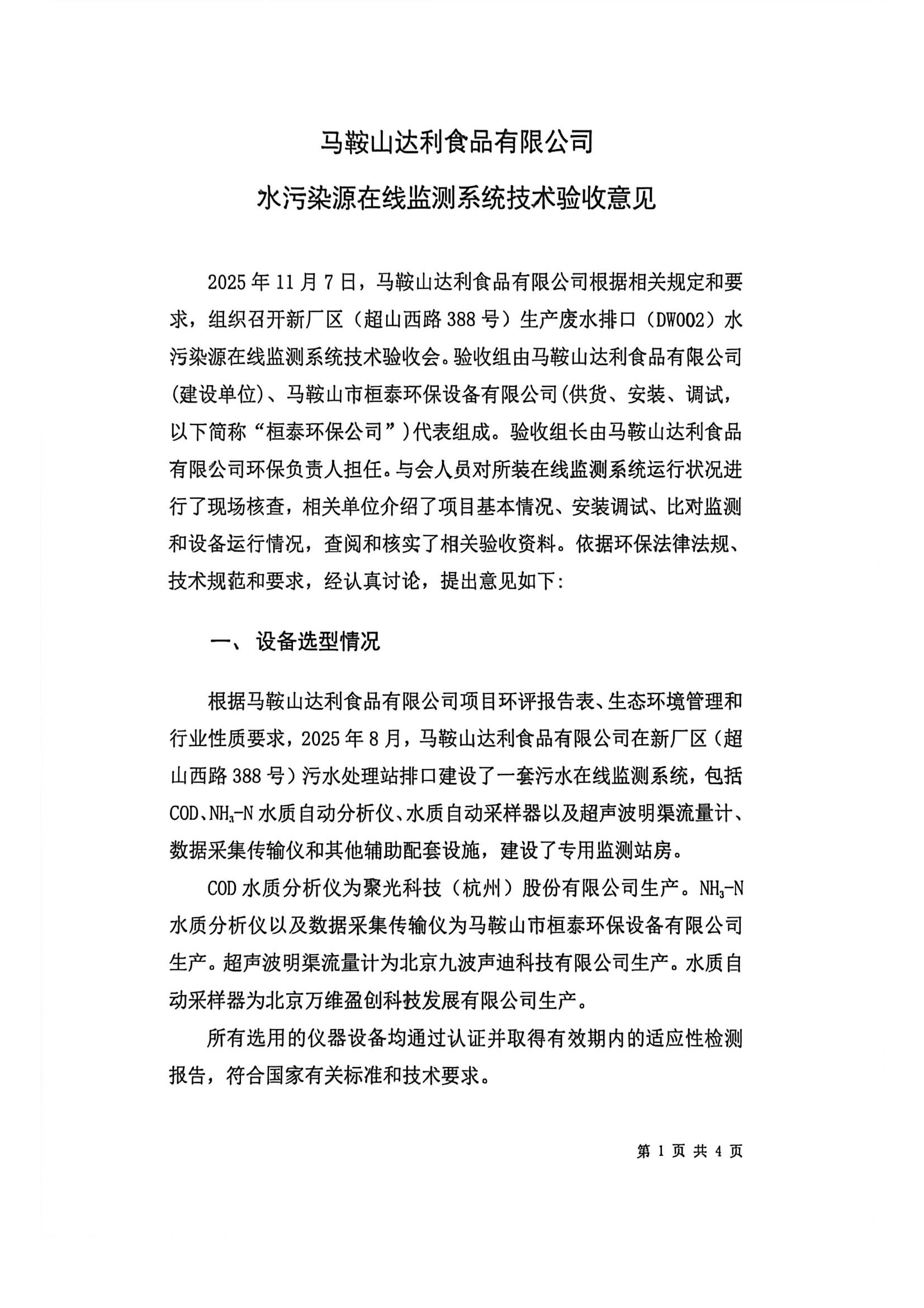 马鞍山达利食品有限公司水污染源在线监测系统技术验收意见